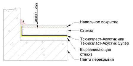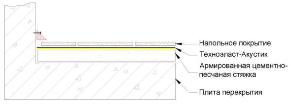 * - методика измерения толщины указана в ТУ на материал. 3. Конструктивные решения плавающих полов.3.1. Конструкция пола по плите перекрытия с устройством плавающей стяжкой: