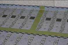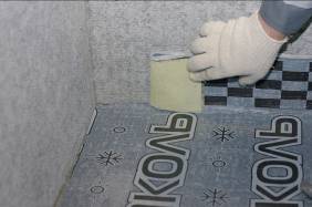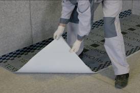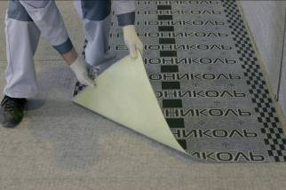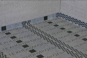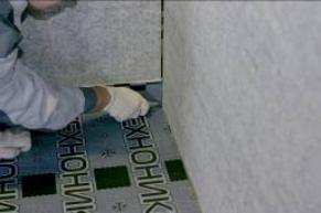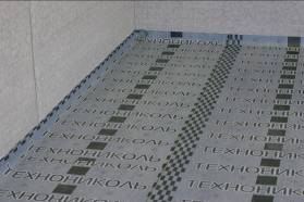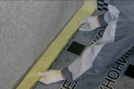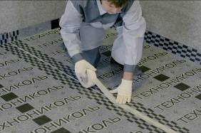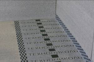 Рулон раскатывают по основанию, примеряют по месту. При примерке необходимо учитывать, что материал укладывают с заведением на стены до высоты финишного покрытия. При необходимости материал обрезают по размеру с помощью острого ножа. Материал укладывают звукоизоляционным геотекстилем к основанию.