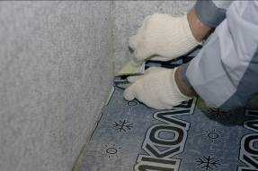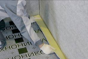 При укладке полотна материала в примыканиях к вертикальным конструкциям, его загибают на высоту до финишного покрытия. Причем полотно материала укладывают геотекстилем к стене. В случае если кромка нахлеста приходится на устройство примыкания, ее срезают до звукоизоляционного слоя.