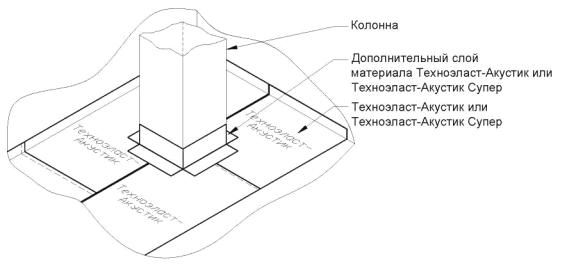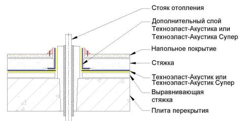В случае проводки труб через пол (трубы отопления, колонны, и т.п.), их оборачивают материалом Техноэласт-Акустик или Техноэласт-Акустик Супер, причем таким образом, чтобы исключить касание плавающей стяжки. Для фиксации материала Техноэласт-Акустик вокруг трубы, его обматывают скотчем.
