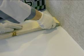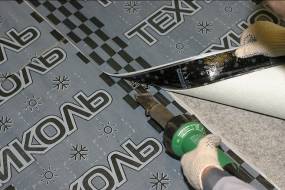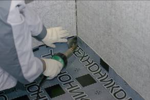 В углу помещения полотно материала надрезают ножом на расстояние высоты подъема материала на вертикальную стенку. Лепесток материала освобождают от геотекстиля и приклеивают его с помощью фена горячего воздуха.