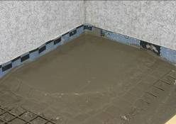 Рядом расположенные рулоны склеивают липкой лентой, шириной не менее 50 мм. Проклеивают продольные швы, поперечные нахлесты, перехлест материала в углу помещения, места прохода труб отопления, и т.п. Теперь можно делать стяжку пола, согласно СНиП 2.03.13 «Полы» по действующим нагрузкам на покрытие пола. Крепление плинтуса производят, как правило, к стенам. Между плинтусом и напольным покрытием оставляют зазор 1 - 2 мм.