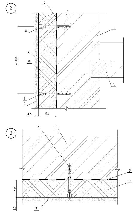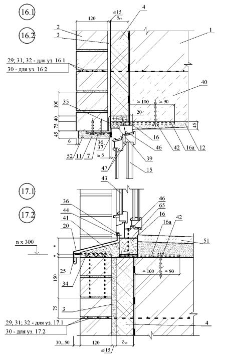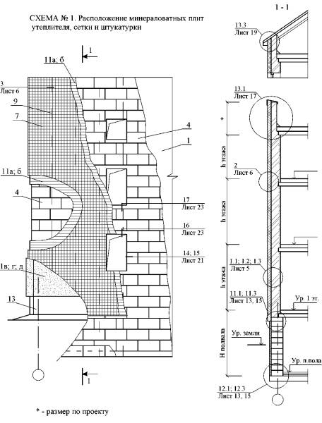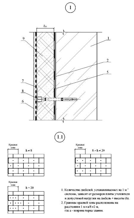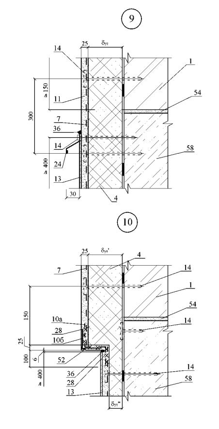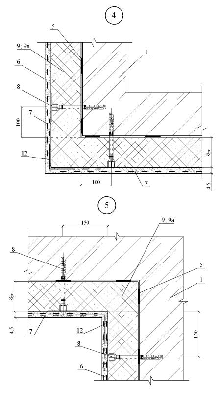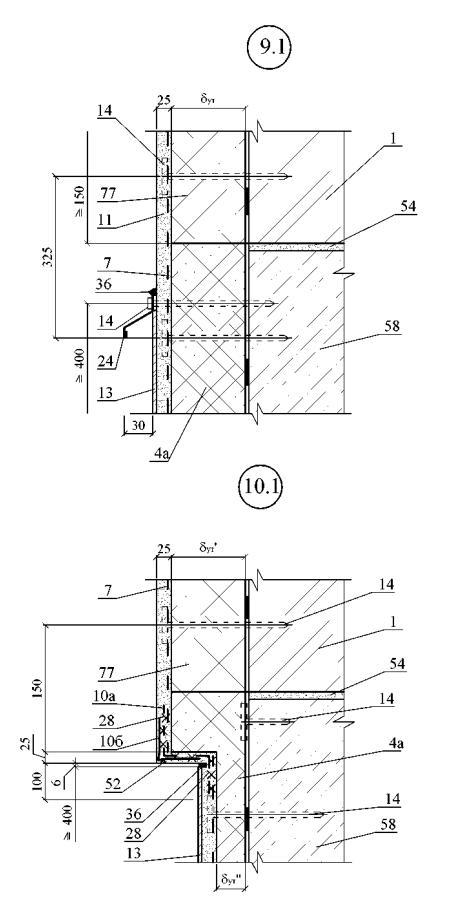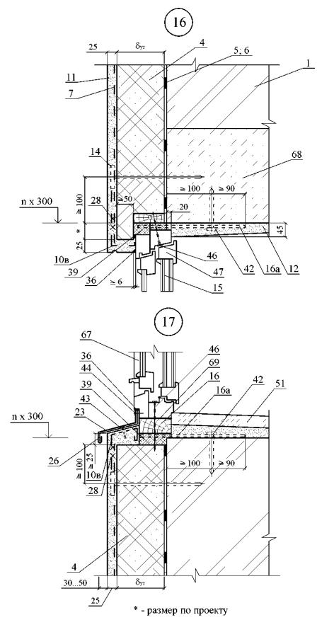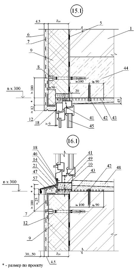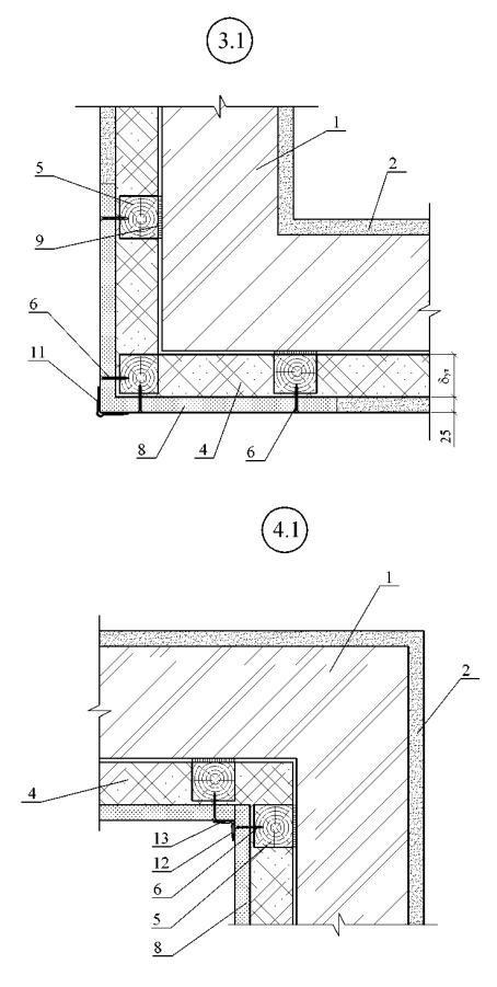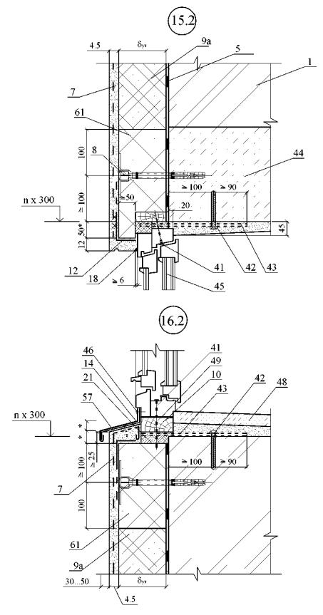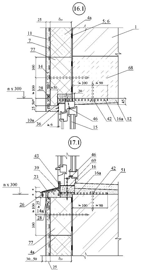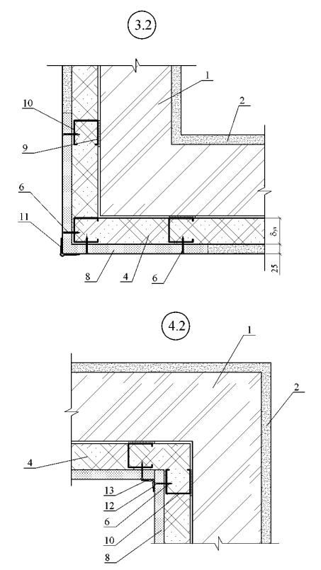 КОНСТРУКТИВНЫЕ РЕШЕНИЯ СТЕНСтена при новом строительстве может быть несущей или самонесущей и представляет собой трехслойную конструкцию с несущим слоем из полнотелого керамического кирпича, бетонных блоков или монолитного железобетона. 4 СТЕНЫ С ОТДЕЛОЧНЫМ СЛОЕМ ИЗ ТРАДИЦИОННОЙ ШТУКАТУРКИ4.1 При отделочном слое из традиционной штукатурки толщиной 25-30 мм в качестве теплоизоляции используются плиты минераловатные «ТЕХНОПЛАСТ», «ТЕХНОФАС» или из экструдированного пенополистирола «ТЕХНОПЛЕКС». 4.2 При защитно-декоративном слое из штукатурки необходимо, чтобы: - штукатурка имела нулевой предел распространения огня; - традиционная штукатурка должна выполняться толщиной 25-30 мм по закрепленной к несущей части стены стальной сетке; - при теплоизоляции из пенополистирола в уровне перекрытий, но не реже чем через 4 м по вертикали, следует предусмотреть рассечки из «негорючих» материалов (из минераловатных плит ««ТЕХНОПЛАСТ», «ТЕХНОФАС» на всю толщину слоя теплоизоляции и высотой не менее толщины перекрытия (не менее 150 мм)); - по контуру оконных и дверных проемов должен предусматриваться слой негорючей теплоизоляции шириной 100-120 мм из минераловатной плиты см. «Пособие по определению пределов огнестойкости конструкций, пределов распространения огня по конструкциям и групп возгораемости материалов (к СНиП II-2-80)», М., ЦНИИСК, 1985г., табл. 10 п.п. 1, 2.30 и табл. 3. - штукатурка на высоту 2,5 м от планировки должна иметь защиту от механических повреждений. 4.3 Теплоизоляционные плиты крепят к несущему слою стены на клею и дополнительно распорными дюбелями. При подготовке несущей части стены до закрепления к ней теплоизоляции рекомендуется использовать при необходимости: антигрибковый препарат, грунтовку. 4.4 Для наклейки теплоизоляционных плит рекомендуется применять клеевую смесь. 4.5 Клей следует наносить на теплоизоляционную плиту с помощью штукатурного шпателя или валиком (шириной 4-6 см) по всему периметру с отступлением от краев на 2-3 см и дополнительно “куличами” на остальную поверхность плиты, при этом площадь приклеенной поверхности плит - не менее 40%. 4.6 Установку плит в проектное положение осуществляют с прижатием к поверхности несущей части стены и выравниванием по высоте относительно друг друга трамбовками. Попадание клея в швы между плитами недопустимо. 4.7 Выравнивание по горизонтали теплоизоляционных плит может осуществляться с помощью временно закрепленной к несущей части стены деревянной рейки или с применением цокольного профиля (изготовленного из алюминия или оцинкованной стали) толщиной 1-1,5 мм, который закрепляют к несущей части стены дюбелями, располагаемыми с шагом не более 300 мм. 4.8 При установке цокольных профилей необходимо оставлять зазор в стыке между ними в 2-3 мм. Для выравнивания вдоль несущей части стены необходимо использовать соответствующие подкладочные шайбы из ПВХ, а для соединения профилей между собой пластмассовые соединительные элементы. 4.9 После установки первого ряда теплоизоляционных плит на цокольный профиль зазор между поверхностью несущей части стены и профилем необходимо заполнить полиуретановой пеной. 4.10 Теплоизоляционные плиты устанавливают вплотную друг к другу. В случае если между ними образуются зазоры более 2 мм их необходимо заполнить материалом используемого утеплителя. 4.11 У