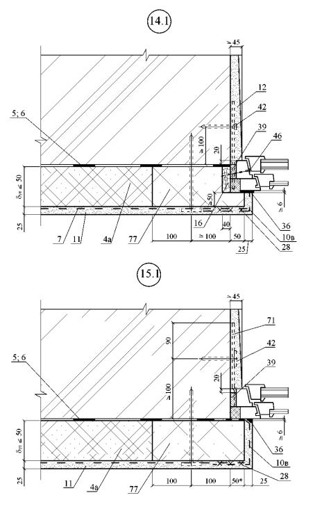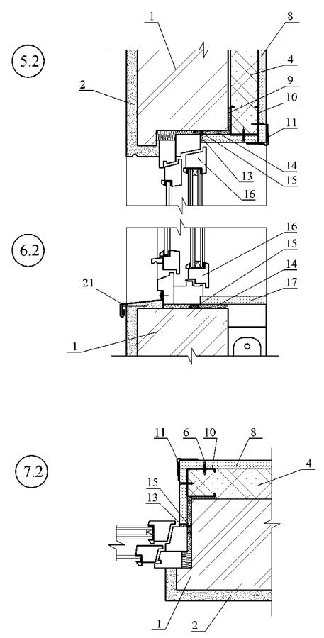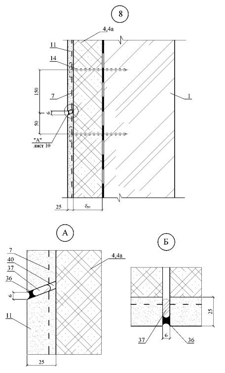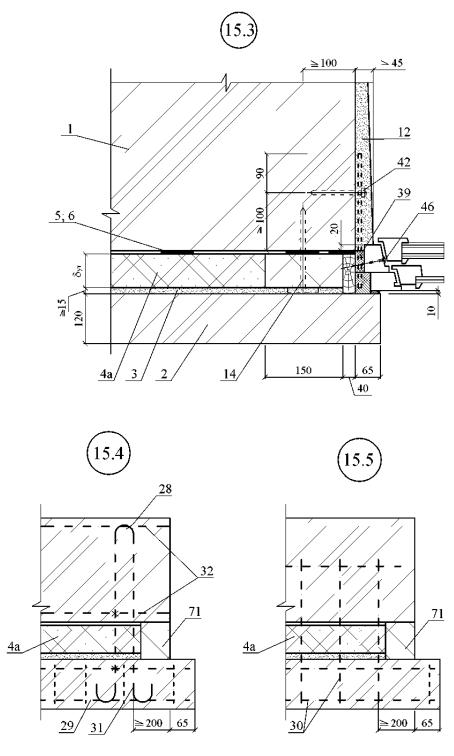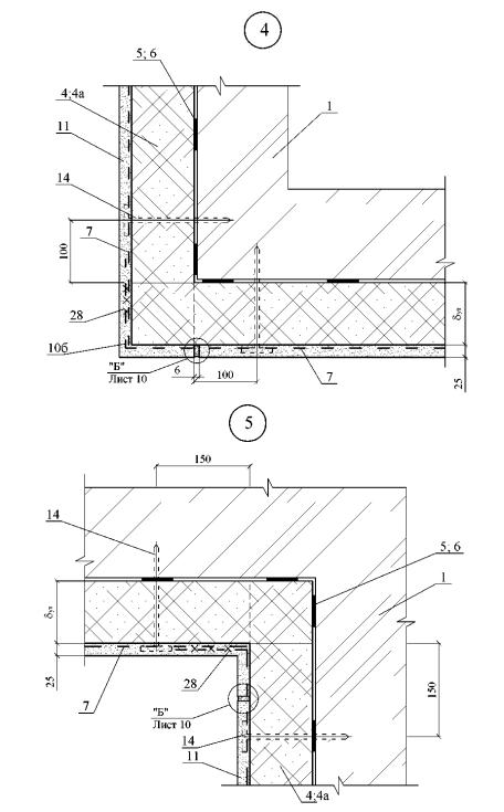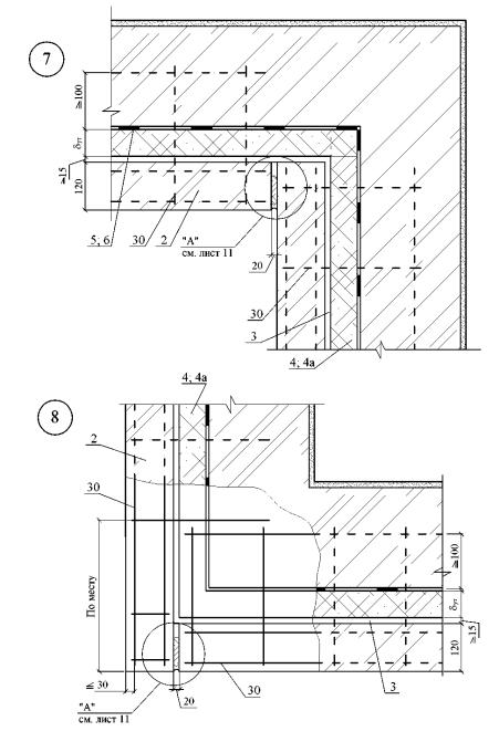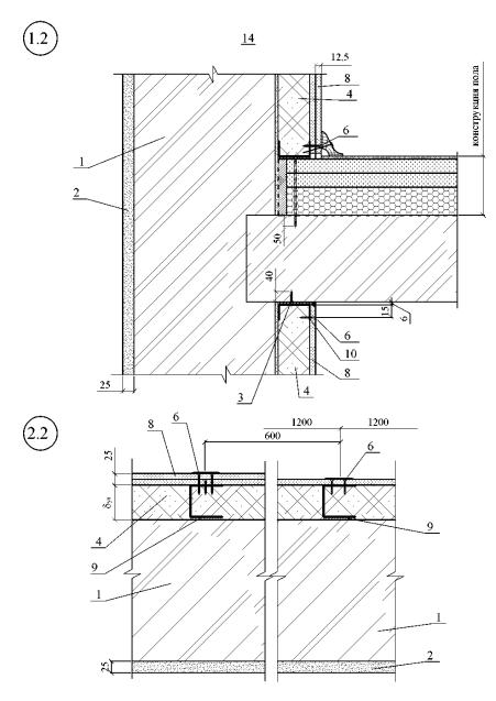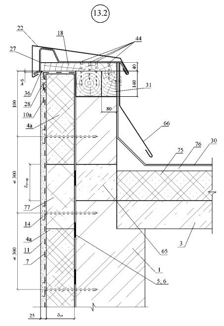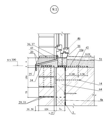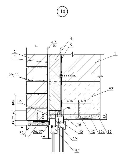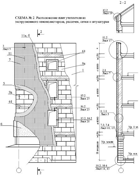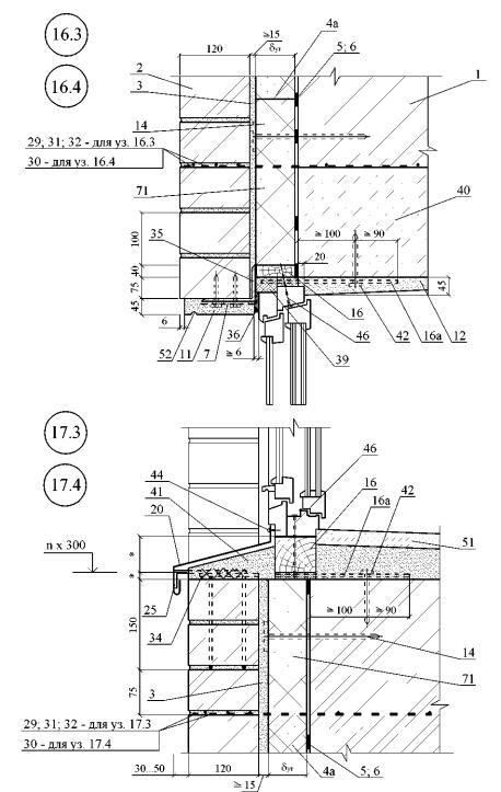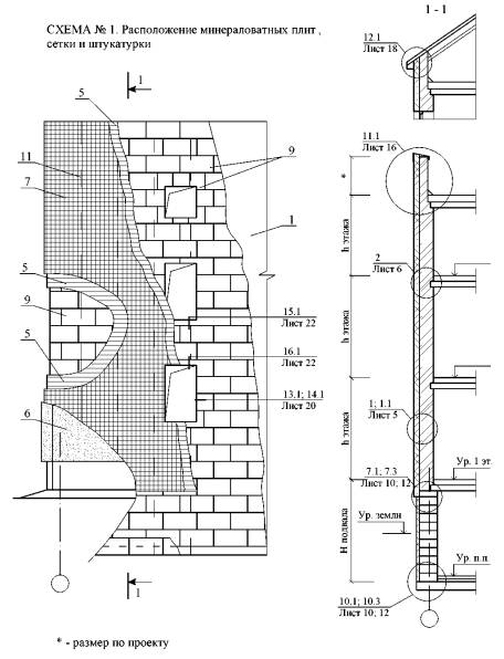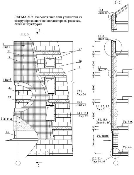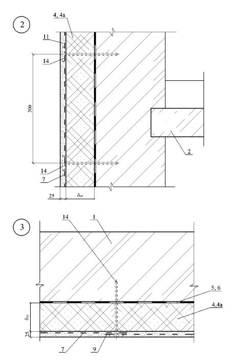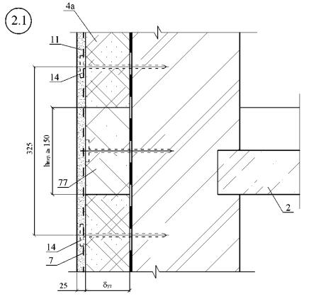КОНСТРУКТИВНЫЕ РЕШЕНИЯ СТЕНСтена при новом строительстве может быть несущей или самонесущей и представляет собой трехслойную конструкцию с несущим слоем из полнотелого керамического кирпича, бетонных блоков или монолитного железобетона. 4 СТЕНЫ С ОТДЕЛОЧНЫМ СЛОЕМ ИЗ ТРАДИЦИОННОЙ ШТУКАТУРКИ4.1 При отделочном слое из традиционной штукатурки толщиной 25-30 мм в качестве теплоизоляции используются плиты минераловатные «ТЕХНОПЛАСТ», «ТЕХНОФАС» или из экструдированного пенополистирола «ТЕХНОПЛЕКС». 4.2 При защитно-декоративном слое из штукатурки необходимо, чтобы: - штукатурка имела нулевой предел распространения огня; - традиционная штукатурка должна выполняться толщиной 25-30 мм по закрепленной к несущей части стены стальной сетке; - при теплоизоляции из пенополистирола в уровне перекрытий, но не реже чем через 4 м по вертикали, следует предусмотреть рассечки из «негорючих» материалов (из минераловатных плит ««ТЕХНОПЛАСТ», «ТЕХНОФАС» на всю толщину слоя теплоизоляции и высотой не менее толщины перекрытия (не менее 150 мм)); - по контуру оконных и дверных проемов должен предусматриваться слой негорючей теплоизоляции шириной 100-120 мм из минераловатной плиты см. «Пособие по определению пределов огнестойкости конструкций, пределов распространения огня по конструкциям и групп возгораемости материалов (к СНиП II-2-80)», М., ЦНИИСК, 1985г., табл. 10 п.п. 1, 2.30 и табл. 3. - штукатурка на высоту 2,5 м от планировки должна иметь защиту от механических повреждений. 4.3 Теплоизоляционные плиты крепят к несущему слою стены на клею и дополнительно распорными дюбелями. При подготовке несущей части стены до закрепления к ней теплоизоляции рекомендуется использовать при необходимости: антигрибковый препарат, грунтовку. 4.4 Для наклейки теплоизоляционных плит рекомендуется применять клеевую смесь. 4.5 Клей следует наносить на теплоизоляционную плиту с помощью штукатурного шпателя или валиком (шириной 4-6 см) по всему периметру с отступлением от краев на 2-3 см и дополнительно “куличами” на остальную поверхность плиты, при этом площадь приклеенной поверхности плит - не менее 40%. 4.6 Установку плит в проектное положение осуществляют с прижатием к поверхности несущей части стены и выравниванием по высоте относительно друг друга трамбовками. Попадание клея в швы между плитами недопустимо. 4.7 Выравнивание по горизонтали теплоизоляционных плит может осуществляться с помощью временно закрепленной к несущей части стены деревянной рейки или с применением цокольного профиля (изготовленного из алюминия или оцинкованной стали) толщиной 1-1,5 мм, который закрепляют к несущей части стены дюбелями, располагаемыми с шагом не более 300 мм. 4.8 При установке цокольных профилей необходимо оставлять зазор в стыке между ними в 2-3 мм. Для выравнивания вдоль несущей части стены необходимо использовать соответствующие подкладочные шайбы из ПВХ, а для соединения профилей между собой пластмассовые соединительные элементы. 4.9 После установки первого ряда теплоизоляционных плит на цокольный профиль зазор между поверхностью несущей части стены и профилем необходимо заполнить полиуретановой пеной. 4.10 Теплоизоляционные плиты устанавливают вплотную друг к другу. В случае если между ними образуются зазоры более 2 мм их необходимо заполнить материалом используемого утеплителя. 4.11 У