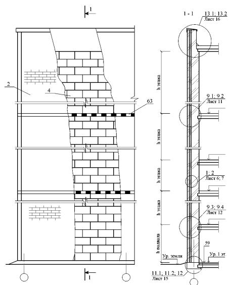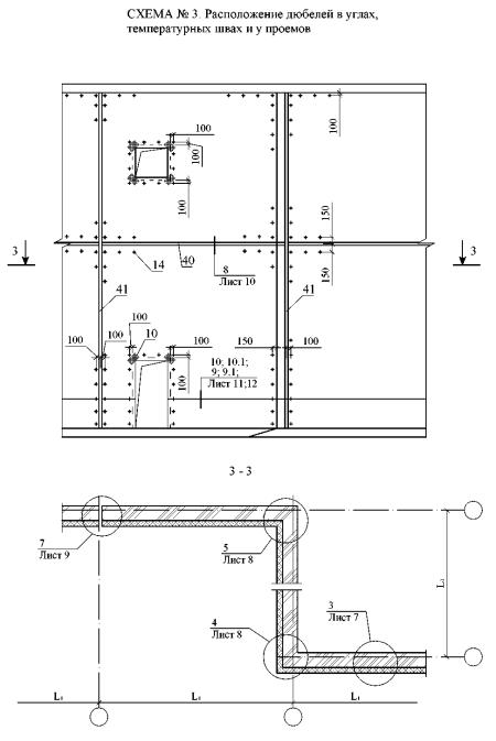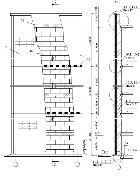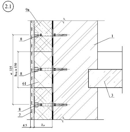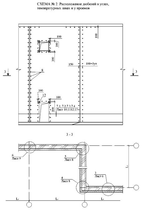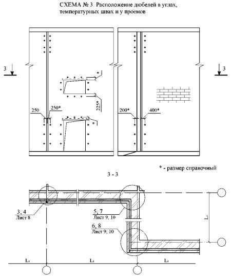 5.12 При тонкослойной штукатурке фасады отделывают устройством защитно-декоративного слоя. Основание под декоративную штукатурку или окраску должно соответствовать требованиям СНиП 3.04.01-87. 5.13 На заармированную стеклосеткой поверхность защитной штукатурки декоративная штукатурная смесь наносится теркой слоем, соответствующим размеру зерна минерального наполнителя. 4.14 Работы по нанесению декоративной штукатурной смеси следует выполнять при температуре воздуха от +5 до +30˚С (для цветных штукатурок от +9˚С) и относительной влажности не более 80%. 6 СТЕНЫ С ЗАЩИТНОЙ СТЕНКОЙ ИЗ КИРПИЧНОЙ КЛАДКИ6.1 Для стен с облицовкой из кирпича толщиной 120 мм используются плиты марки «ТЕХНОБЛОК СТАНДАРТ», «ТЕХНОБЛОК ОПТИМА», «ТЕХНОБЛОК ПРОФ» или из экструдионного пенополистирола «ТЕХНОПЛЕКС». 6.2 При устройстве защитной кирпичной стенки может применяться кирпич или камни керамические лицевые (ГОСТ 7484-78) или отборные стандартные (ГОСТ 530-95) предпочтительно полусухого прессования, а также силикатный кирпич (ГОСТ 379-95). При облицовке силикатным кирпичом цоколь, пояса, парапеты и карниз выполняют из керамического кирпича. При новом строительстве защитная стенка из кирпича может выполняться на всю высоту здания. При этом она может быть самонесущей до высоты 6-7 м, а далее навесной с опиранием на пояса (несущая балка пояс) выступающие из несущей стены через каждые 2 этажа (6-7 м) по высоте здания. При этом несущая часть стены и балка пояс в соответствии с п. 6.35 СНиП II-22-81 крепятся к перекрытиям анкерами сечением не менее 0,5 см2. Шаг анкеров должен быть не более 6 м. При реконструкции кирпичная защитная стенка обязательна в виде цоколя высотой не менее 2,5 м от планировочной отметки. По архитектурным соображениям она может быть выполнена самонесущей и большей высоты. 6.3. При защитной стенке из кирпича кладка ведется с обязательным заполнением раствором горизонтальных и вертикальных швов и расшивкой с фасадной стороны. Шаг температурных швов в кирпичной облицовке принимается по СНиП II-22-81*, как для не отапливаемых зданий. 6.4. При облицовке кирпичной кладкой в новом строительстве последняя армируется с несущей частью стены сварными арматурными сетками, располагаемыми с шагом по высоте 600 мм; площадь поперечных стержней (связей) должна быть не менее 0,4 см2/м2 (глава СНиП II-22-81, п. 6.32). При реконструкции кирпичная облицовка связывается с существующей кладкой с помощью кронштейнов закрепленных на дюбелях. При этом рекомендуются дюбели типа Д1 ВЗ-1 III (Бийского завода стеклопластиков), НРS-I фирмы «Хилти» или ДГ (табл. 8). Таблица 8