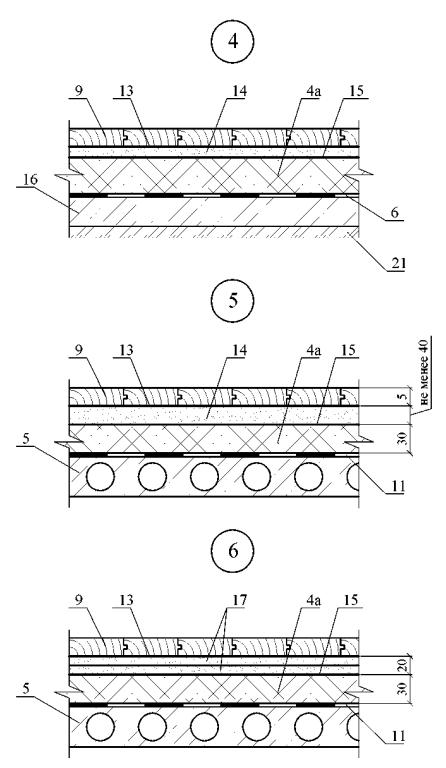6. В соответствии с таблицей 6 СНиП 23-03-2003 данная конструкция перекрытия с покрытием пола из паркета удовлетворяет только нормативным требованиям, предъявляемым к перекрытиям между комнатами в двух уровнях в домах категории «В». Следует изменить конструкцию пола, предусмотрев для устройства звукоизоляции плиты минераловатные толщиной 6 см.