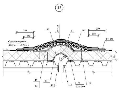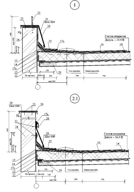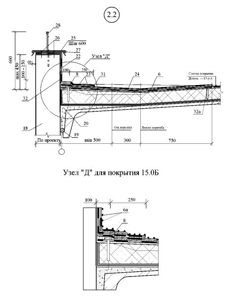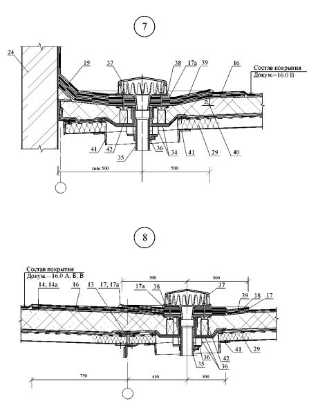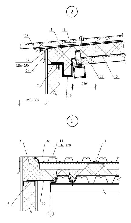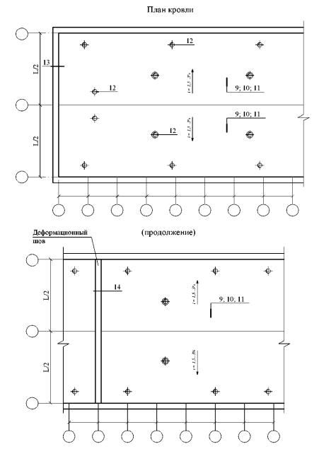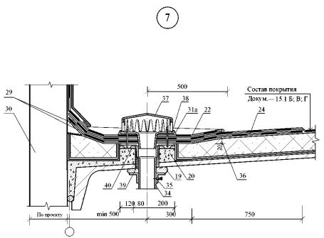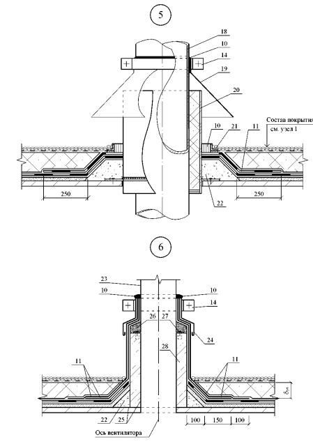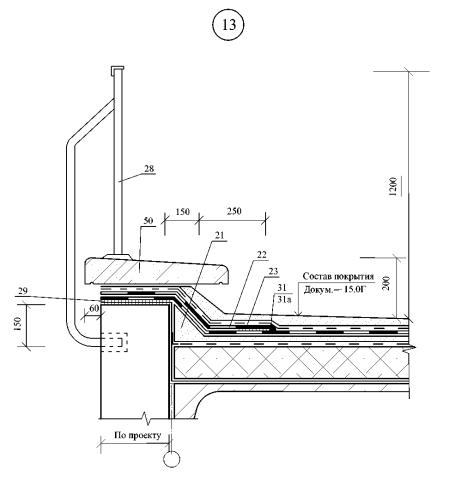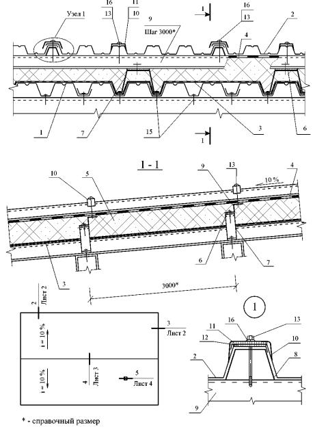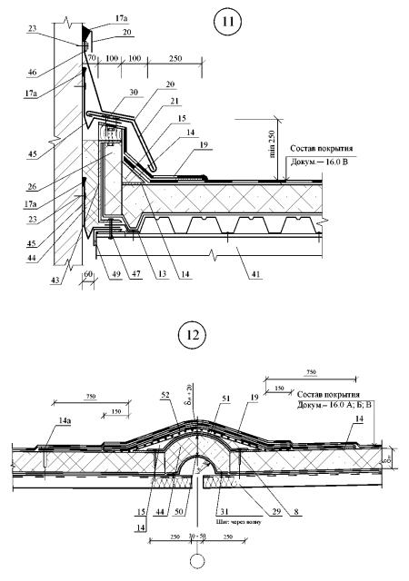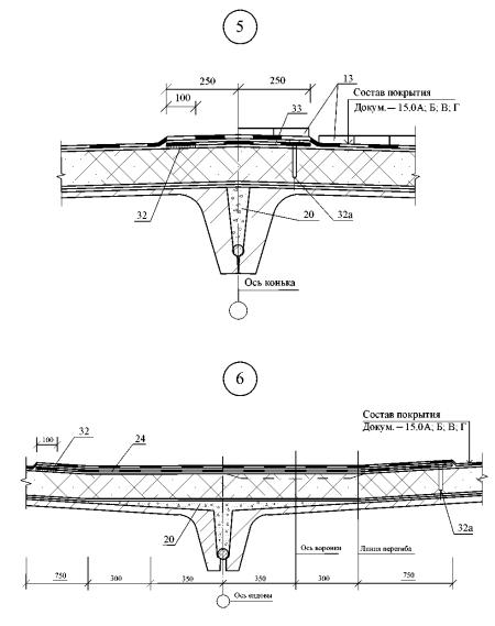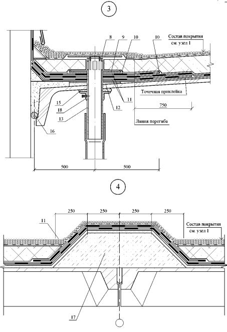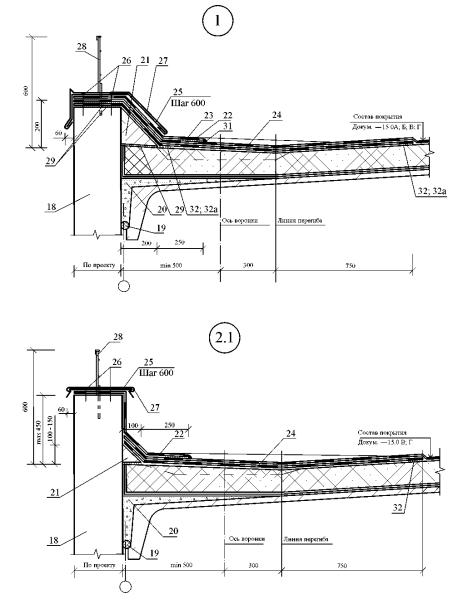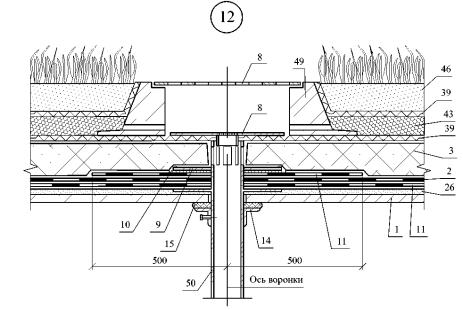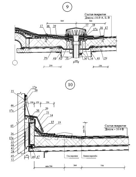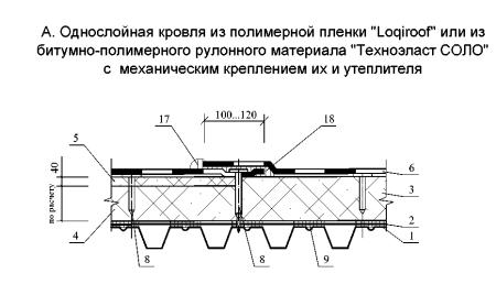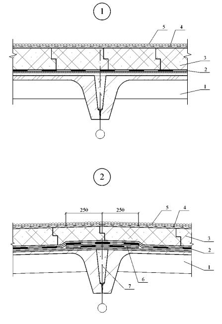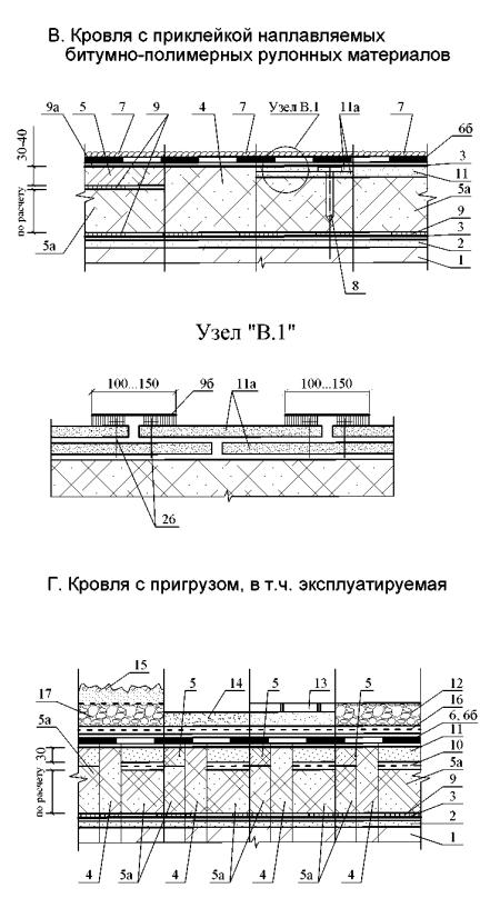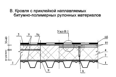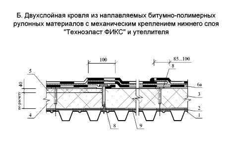 11.20 При реконструкции железобетонных покрытий дополнительная теплоизоляция устраивается по существующей рулонной кровле, отремонтированной в соответствии со СО-002-02495342-2005 «Кровли зданий и сооружений. Проектирование и строительство», М., ОАО «ЦНИИПромзданий», 2005 г., при этом особое внимание обращается на состояние примыкания кровли к деформационным швам, парапетам, вентшахтам, трубам. В зоне воронок внутреннего водостока полностью удаляются старая теплоизоляция и кровля. Воронки поднимаются на новый уровень; кровля в зоне примыкания к воронке должна быть понижена относительно прилегающих участков на 15-20 мм. 11.21 Над существующими в старой кровле разжелобками (ендовами) минераловатные плиты по разметке прорезают пилой, обеспечивая их плотное прилегание к основанию. 12 ЖЕЛЕЗОБЕТОННЫЕ ПОКРЫТИЯ С РУЛОННОЙ КРОВЛЕЙ (ИНВЕРСИОННАЯ КРОВЛЯ)12.1 Вариант покрытия с теплоизоляцией из пенополистирольных плит ТЕХНОПЛЕКС: - железобетонные плиты; - стяжку толщиной 20 мм из цементно-песчаного раствора; - кровельный ковер; - слой теплоизоляции ТЕХНОПЛЕКС; - фильтрующий слой; - пригрузочный или защитный слой. 12.2 Инверсионные кровли рекомендуется выполнять на покрытиях с уклоном 1,5-3%, ендовы выполняются без уклона. 12.3 Подготовка поверхности покрытия, включая устройство по несущим плитам выравнивающей стяжки или уклонообразующего слоя из легкого бетона и выравнивающей затирки (стяжки) - в соответствии с указаниями п. 9.1. 12.4 Плиты теплоизоляции приклеивают к кровле горячим битумом. Температура приклеивающего состава не должна превышать 75оС. Приклейка может быть полосовой или точечной, но равномерной. 12.5 По плитам теплоизоляции устраивают фильтрующий слой из не гниющих водопропускающих материалов типа геотекстиль. Затем выполняют пригрузку плит теплоизоляции гравием фракцией 20-40 мм из расчета не менее 50 кг/м2 покрытия, либо тротуарными плитками. На эксплуатируемых кровлях выполняют защитный слой из цементно-песчаного раствора, бетона, плиток на растворе и т.п. 12.6 В любом случае конструкцию покрытия проверяют на несущую способность, а кровлю на ветровой отсос. В случае необходимости участки кровли с отрицательным давлением ветра (конек, парапет) пригружают дополнительно. 12.7 Для отвода атмосферной влаги с кровли может быть использована воронка, которая при необходимости комплектуется встроенным саморегулирующимся электрокабелем мощностью 10-30 Вт. 13 ПОКРЫТИЯ С ПРОФИЛИРОВАННЫМ НАСТИЛОМ И РУЛОННОЙ КРОВЛЕЙ13.1 Покрытие включает следующие конструкционные слои: - стальной профилированный настил; - пароизоляционный слой (по расчету); - теплоизоляцию из минераловатных плит «ТЕНОРУФ Н», «ТЕНОРУФ В», «ТЕНОРУФ» (ТУ 5762-043-17925162-2006), «ТЕНОРУФ ДВУХСЛОЙНЫЙ» (ТУ 5762-002-74182181-2007); - водоизоляционный ковер из рулонных материалов. 13.2 В местах примыкания профнастила к стенкам парапетов, к деформационным швам, к водосточным воронкам, а также с каждой стороны конька и ендовы следует предусматривать заполнение пустот ребер настилов (со стороны теплоизоляции) на длину 250 мм заглушками из негорючих минераловатных материалов. 13.3 При устройстве пароизоляции поверхности стальных профилированных настилов должны быть очищены от пыли, строительного мусора и обезжирены растворителем, а полки настилов огрунтованы битумным праймером. 13.4 Теплоизоляционные минераловатные пли