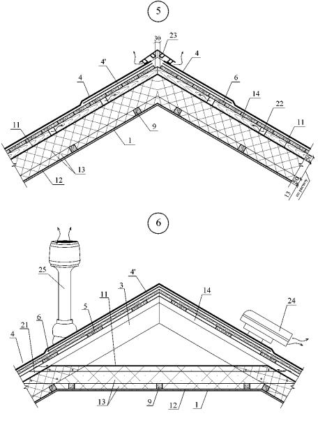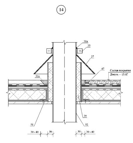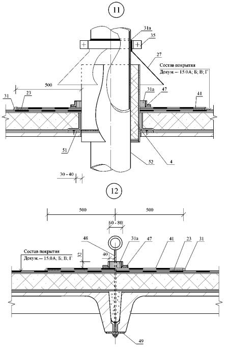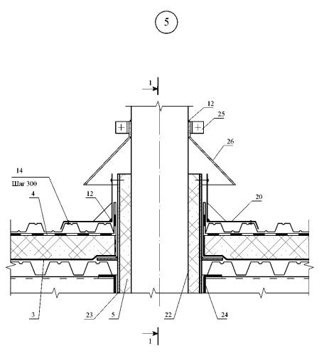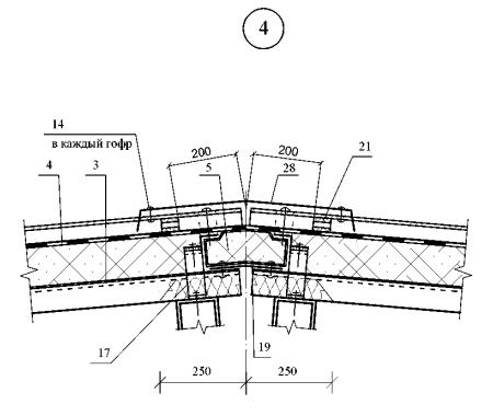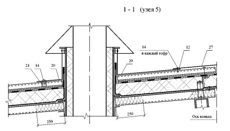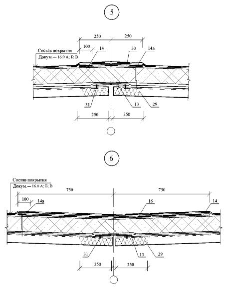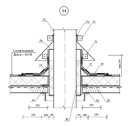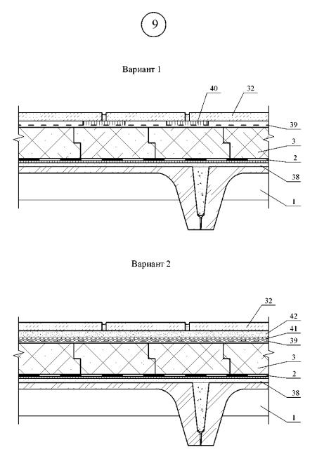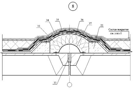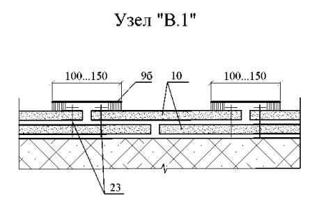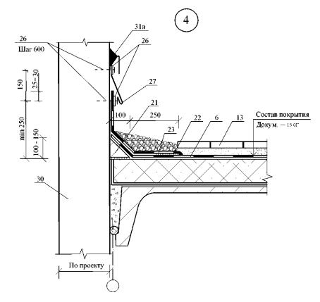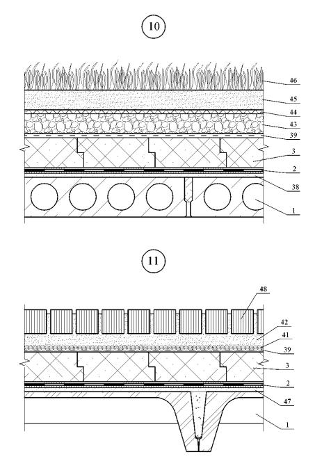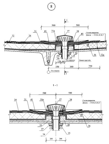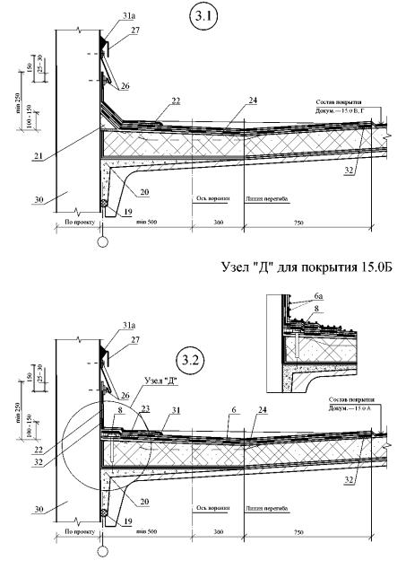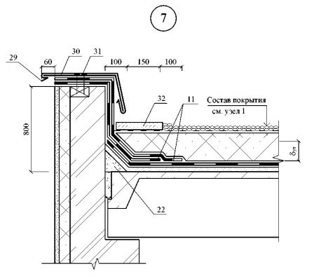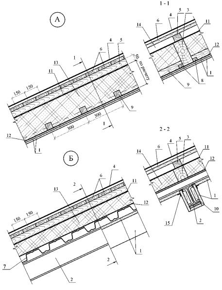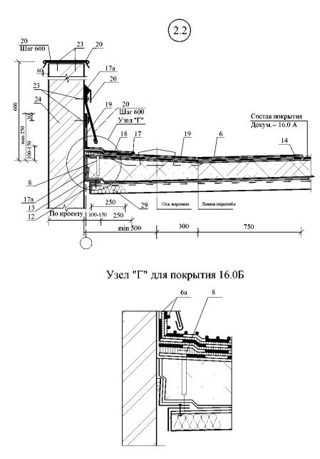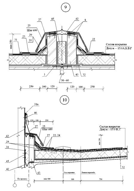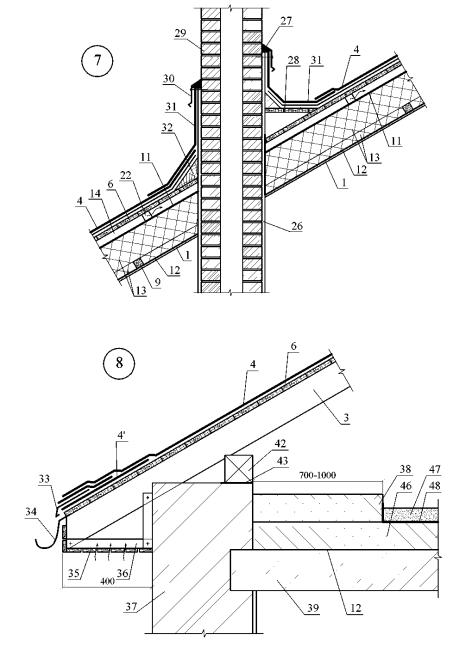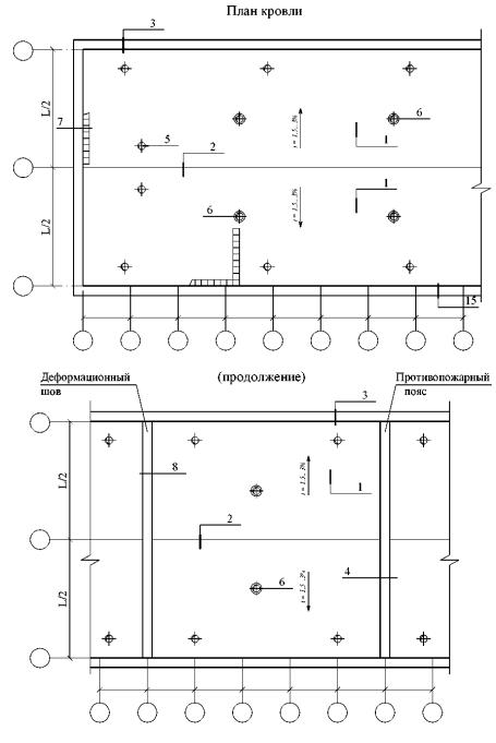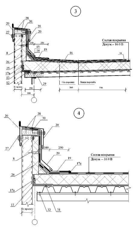 11.20 При реконструкции железобетонных покрытий дополнительная теплоизоляция устраивается по существующей рулонной кровле, отремонтированной в соответствии со СО-002-02495342-2005 «Кровли зданий и сооружений. Проектирование и строительство», М., ОАО «ЦНИИПромзданий», 2005 г., при этом особое внимание обращается на состояние примыкания кровли к деформационным швам, парапетам, вентшахтам, трубам. В зоне воронок внутреннего водостока полностью удаляются старая теплоизоляция и кровля. Воронки поднимаются на новый уровень; кровля в зоне примыкания к воронке должна быть понижена относительно прилегающих участков на 15-20 мм. 11.21 Над существующими в старой кровле разжелобками (ендовами) минераловатные плиты по разметке прорезают пилой, обеспечивая их плотное прилегание к основанию. 12 ЖЕЛЕЗОБЕТОННЫЕ ПОКРЫТИЯ С РУЛОННОЙ КРОВЛЕЙ (ИНВЕРСИОННАЯ КРОВЛЯ)12.1 Вариант покрытия с теплоизоляцией из пенополистирольных плит ТЕХНОПЛЕКС: - железобетонные плиты; - стяжку толщиной 20 мм из цементно-песчаного раствора; - кровельный ковер; - слой теплоизоляции ТЕХНОПЛЕКС; - фильтрующий слой; - пригрузочный или защитный слой. 12.2 Инверсионные кровли рекомендуется выполнять на покрытиях с уклоном 1,5-3%, ендовы выполняются без уклона. 12.3 Подготовка поверхности покрытия, включая устройство по несущим плитам выравнивающей стяжки или уклонообразующего слоя из легкого бетона и выравнивающей затирки (стяжки) - в соответствии с указаниями п. 9.1. 12.4 Плиты теплоизоляции приклеивают к кровле горячим битумом. Температура приклеивающего состава не должна превышать 75оС. Приклейка может быть полосовой или точечной, но равномерной. 12.5 По плитам теплоизоляции устраивают фильтрующий слой из не гниющих водопропускающих материалов типа геотекстиль. Затем выполняют пригрузку плит теплоизоляции гравием фракцией 20-40 мм из расчета не менее 50 кг/м2 покрытия, либо тротуарными плитками. На эксплуатируемых кровлях выполняют защитный слой из цементно-песчаного раствора, бетона, плиток на растворе и т.п. 12.6 В любом случае конструкцию покрытия проверяют на несущую способность, а кровлю на ветровой отсос. В случае необходимости участки кровли с отрицательным давлением ветра (конек, парапет) пригружают дополнительно. 12.7 Для отвода атмосферной влаги с кровли может быть использована воронка, которая при необходимости комплектуется встроенным саморегулирующимся электрокабелем мощностью 10-30 Вт. 13 ПОКРЫТИЯ С ПРОФИЛИРОВАННЫМ НАСТИЛОМ И РУЛОННОЙ КРОВЛЕЙ13.1 Покрытие включает следующие конструкционные слои: - стальной профилированный настил; - пароизоляционный слой (по расчету); - теплоизоляцию из минераловатных плит «ТЕНОРУФ Н», «ТЕНОРУФ В», «ТЕНОРУФ» (ТУ 5762-043-17925162-2006), «ТЕНОРУФ ДВУХСЛОЙНЫЙ» (ТУ 5762-002-74182181-2007); - водоизоляционный ковер из рулонных материалов. 13.2 В местах примыкания профнастила к стенкам парапетов, к деформационным швам, к водосточным воронкам, а также с каждой стороны конька и ендовы следует предусматривать заполнение пустот ребер настилов (со стороны теплоизоляции) на длину 250 мм заглушками из негорючих минераловатных материалов. 13.3 При устройстве пароизоляции поверхности стальных профилированных настилов должны быть очищены от пыли, строительного мусора и обезжирены растворителем, а полки настилов огрунтованы битумным праймером. 13.4 Теплоизоляционные минераловатные пли