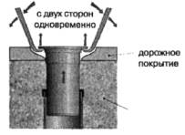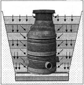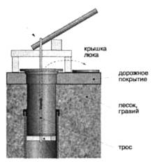 Рис. 4 В описанных выше ситуациях требуется только оставить внутри тела колодца соответствующий запас длины телескопа (ок. 30-40 см), а также 20 см длины телескопа для его стабилизации. Если необходимо регулировать (поднимать) люк, нужно убрать слой грунта, удерживающий чугунную подставку, и, приподняв его, вытащить телескоп до нужного уровня. Общие правила установки колодцевПоследовательность действий при монтаже канализационных и дренажных колодцев зависит от типа колодца и элементов, входящих в состав конструкции. Разница в монтаже связана прежде всего с типом верхнего элемента колодца (это может быть чугунный люк либо бетонное кольцо с бетонным или чугунным люком), а также с конструкцией нижней части колодца (колодец может быть с отстойником или без него). При выполнении монтажных работ нужно учитывать заложенные в проекте особенности расположения входных и выходных отверстий колодца относительно друг друга, а также их размещение относительно дна колодца. На рис. 5 показан типовой случай установки колодца с послойным уплотнением пазух траншеи.