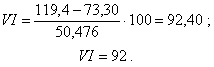 где U - кинематическая вязкость при 40 °С нефтепродукта, индекс вязкости которого требуется определить (D = L - H), мм2/с. 4.1.4. Пример расчета VI Кинематическая вязкость нефтепродуктов при 40 °С равна 73,30 мм2/с, при 100 °С - 8,86 мм2/с. По таблице 3 (интерполяцией) L = 119,94; D = 50,476. Полученные данные подставляют в формулу (4) и округляют до целого числа
