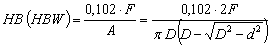 когда усилие F выражено в кгс. Твердость по Бринеллю обозначают символом НВ (HBW), которому предшествует числовое значение твердости из трех значений цифр, и после символа указывают диаметр шарика, значение приложенного усилия (в кгс), продолжительность выдержки, если она отличается от 10 до 15 с. Примеры обозначения: 250 HВ 5/750 - твердость но Бринеллю 250, определенная при применении стального шарика диаметром 5 мм, при усилии 750 кгс (7355 Н) и продолжительности выдержки от 10 до 15 с; 575 HBW 2,5/187, 5/30 - твердость по Бринеллю 575, определенная при применении шарика из твердого сплава диаметром 2,5 мм, при усилии 187,5 кгс (1839 Н) и продолжительности выдержки 30 с; При определении твердости стальным шариком или шариком из твердого сплава диаметром 10 мм при усилии 3000 кгс (29420 Н) и продолжительности выдержки от 10 до 15 с твердостью по Бринеллю обозначают только числовым значением твердости и символом НВ или HBW: например, 185 HB, 600 HBW. Обозначения параметров приведены на чертеже.
