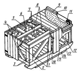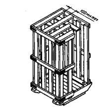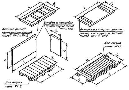 Примечание. Внутреннее расположение деталей ящиков с обшивкой листовыми древесными материалами указано в приложении 3; для ящиков типа VI-3 черт. 26, типа VI-4 черт. 27, типа VII - черт. 28. Допускается изготовлять ящики типов: I - с внутренним расположением планок и раскосов; с досками боковых стенок, дна и крышки, состоящими из двух отрезков при длине ящика более 4000 мм. Стыковка отрезков производится на планках пояса, при этом на каждой планке доски стыкуются через две и более; с полозьями; I-3, I-4, V - разборными, для грузов массой до 500 кг; I-3, II-1, III-1, IV-1 и V-1 - с решетчатым дном для грузов, имеющих сплошное жесткое основание, и для грузов, закрепленных на крепежных брусьях или полозьях, если это не влияет на сохранность и качество грузов; I-3, I-4, II, III, IV, V и VIII - с полозьями и продольными брусьями боковых стенок длиной более 4000 мм, составными по длине в соответствии с приложением 4, причем стыки отдельных отрезков не должны находиться на одном уровне; с полозьями, составными по ширине, в соответствии с приложением 5; с полозьями или дном из профильного проката (двутавр, швеллер), при этом предельные допустимые изгибающие моменты должны быть одинаковыми Мпред.с= Мпред.д; с применением брусьев, стоек, раскосов щитов и досок крышки других сечений, без уменьшения момента сопротивления изгибу; с досками дна, составными по длине, при трех и более полозьях, со стыковкой по оси полоза шириной не менее 125 мм; II-1 и И-2 - с горизонтальным расположением досок обшивки торцовых стенок и установкой угловых стоек только на торцовых стенках для грузов массой до 3000 кг; II-2, IV-2 - с плотным дном и крышкой, с плотной крышкой; II и III-1 - с дополнительными продольными планками сечением 40´60 мм по краям на дне ящика, прибиваемыми к доскам дна, для ящиков типа II - с внутренней стороны, для ящиков типа III-1 - с наружной стороны. При креплении боковых стенок длиной и высотой более 2000 мм, а также в случае установки боковых стенок на полозья доски дна должны быть смещены или уменьшены по ширине на толщину досок обшивки. При ширине ящика свыше 1000 мм устанавливается дополнительная продольная планка посередине ящика; II и IV - с досками обшивки, состоящими из двух отрезков, при высоте ящика более 2000 мм, при этом стыковка производится по оси среднего горизонтального бруса шириной не менее 100 мм; III - решетчатыми с величиной просвета между досками не более 100 мм; III-1 - с перекрытием торцовых стенок боковыми; IV-2 - с обшивкой решетчатыми щитами шириной от 700 до 1000 мм с просветами между деталями щита до 400 мм для боковых и торцовых стенок; V - с раскосами; VII, VIII - для ящиков длиной или высотой более 2000 мм с дополнительными продольными брусьями, прибиваемыми с внутренней стороны ящика к доскам дна; с прорезями в продольных и крайних поперечных деталях крышки рамной конструкции для обеспечения стока воды; VIII - с решетчатым дном и крышкой, если это не влияет на сохранность и качество груза; VIII-1 с облегченным каркасом и крышкой рамной конструкции, нештабелируемые, перевозимые железнодорожным и автомобильным транспортом; VIII-4 - облегченными, нештабелируемыми для грузов массой до 5000 кг, с крышкой рамной конструкции с обшивкой листовыми древесными материалами; VIII-4 - с обшивкой стенок и крышки древесно-волокнистой плитой, находящейся между досками, расположенными во взаимно перпендикулярном направлении, с обшивкой фанерой с 