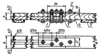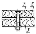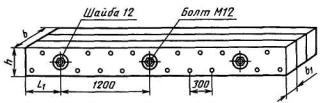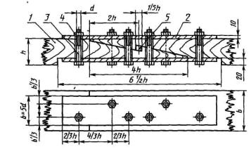 2. Расстояние между осями болтов, расположенных в разных плоскостях и соединяющих детали составного по ширине полоза, и болтами, служащими для крепления торцового и крепежного брусьев к полозу, должно быть не менее 50 мм, расстояние между осями болтов, соединяющих детали полоза, должно быть не более 1200 мм.