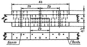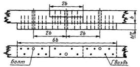 1.4. При прибивании поясов из стальной ленты, угольников, накладок длина гвоздей или шурупов не должна превышать суммы толщин деревянных деталей в этом сечении.