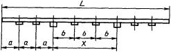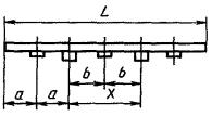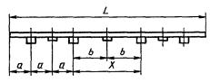 где A0 - расстояние между точками захвата полоза стропами, мм; В - наружная ширина ящика, мм; H - наружная высота ящика без подполозной доски, мм. При получении значения X менее 1/3 длины ящика результат округляют до значения Х= 1/3. Формула справедлива при минимально допускаемом угле a = 45°. a - угол наклона плоскости, ограниченной ветвями строповочного троса и отрезком ребра боковой стенки, над плоскостью крышки ящика. Кроме основных поперечных брусьев крышки должны устанавливаться дополнительные поперечные брусья на равных расстояниях друг от друга в пределах прохождения строп на расстоянии Х и за его пределами. Для штабелируемых ящиков основные и дополнительные поперечные брусья должны иметь одинаковые размеры и выбираться по табл. 13. Таблица 13 мм