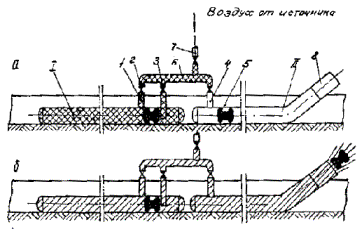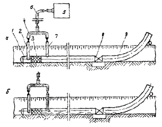 Рис. 6. Принципиальная схема продувки промыслового трубопровода: а - продувка природным газом от скважины; б - продувка сжатым воздухом; 1 - скважина; 2 - трубопровод; 3 - кран; 4 - заглушка; 5 - компенсатор; 6 - подводящий патрубок; 7 - продувочный патрубок; 8 - коллектор; 9 - компрессор Диаметр перепускной (байпасной) линии и полнопроходного крана на ней должен быть равен 0,3 диаметра продуваемого участка. 2.40. При подаче газа от скважины или действующего газопровода давление в начале продуваемого участка должно составлять 0,5-0,7 от минимальных величин, указанных в табл. 1. 2.41. Надземные, монтируемые на опорах трубопроводы следует продувать с пропуском очистных устройств облегченной конструкции, масса и скорость перемещения которых не вызовут разрушения трубопровода или опор. 2.42. Для продувки надземных трубопроводов используют очистные поршни типа ОПКЛ или поршни-разделители типа ПР, ДЗК, ДЗК-РЭМ. 2.43. Пропуск поршней по надземным трубопроводам следует осуществлять под давлением газа или воздуха со скоростью не более 10 км/ч. 2.44. При любом способе прокладки трубопровода протяженность участка продувки с пропуском очистных или разделительных устройств устанавливается с учетом технической характеристики устройства (предельной длины его пробегами) давления продувки. 2.45. Продувка трубопроводов (кроме магистральных газопроводов) проводится с пропуском одного очистного устройства. Продувка с пропуском очистного устройства считается законченной, когда после вылета очистного устройства из продувочного патрубка выходит струя незагрязненного воздуха или газа. Если после вылета очистного устройства из трубопровода выходит струя загрязненного воздуха или газа, необходимо провести повторную продувку участка. Если после вылета очистного устройства из продувочного патрубка выходит вода, по трубопроводу дополнительно следует пропустить разделитель. На магистральных газопроводах производится трехкратная продувка с пропуском очистных устройств. 2.46. Продувка без пропуска очистных устройств осуществляется скоростным потоком воздуха или газа. 2.47. Для продувки без пропуска поршня давление воздуха или газа в ресивере при соотношении объемов ресивера и продуваемого участка 2:1 и диаметре перепускной линии, равном 0,3 диаметра продувочного трубопровода, определяется по табл. 1. 2.48. Протяженность участка трубопровода, продуваемого без пропуска поршней, не должна превышать 5 км. 2.49. Продувка без пропуска очистного устройства считается законченной, когда из продувочного патрубка выходит струя незагрязненного воздуха или газа. Продувка с использованием высокопроизводительных компрессорных установок 2.50. Продувка трубопроводов с использованием высокопроизводительных мобильных компрессорных установок на базе авиационных двигателей производится следующими методами: скоростным потоком воздуха непосредственно от компрессорной установки (без применения ресивера и без пропуска очистного устройства); с пропуском очистного устройства под давлением воздуха непосредственно от компрессорной установки (без применения ресивера); с пропуском очистного устройства под давлением воздуха из ресивера, заполненного от компрессорной установки; в комбинированном режиме, предусматривающем предварительную продувку полости трубопровода скоростным потоком