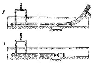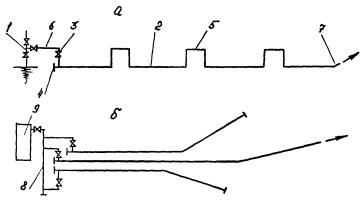 Рис. 17. Принципиальные схемы узлов приема поршней-разделителей, монтируемых на газопроводах: а - закрытого типа; б - открытого типа с задвижкой; 1 - линейный кран; 2 - манометр; 3- сигнализатор для контроля за движением разделителя. 4 - очистные или разделительные устройства; 5 - стопор; 6 - сливной патрубок; 7 - контрольный сливной патрубок. 5. КОМПЛЕКСНЫЕ ПРОЦЕССЫ ОЧИСТКИ ПОЛОСТИ, ИСПЫТАНИЯ И УДАЛЕНИЯ ЖИДКОСТИ5.1. Завершающие процессы строительства трубопроводов: очистка полости, испытание и удаление жидкости должны быть объединены общими технологическими и организационными решениями в едином комплексном процессе. 5.2. В комплексные процессы, помимо основных процессов очистки полости, испытания, удаления жидкости, входят следующие работы: подготовительные (сварочно-монтажные и другие работы) обеспечивают возможность проведения основных процессов; промежуточные (сварочно-монтажные и другие работы) обеспечивают возможность последовательного проведения соответствующих основных процессов; заключительные (сварочно-монтажные и другие работы) проводят с целью демонтажа узлов и оборудования, использованных при очистке полости и испытании, и подготовки объекта (участка) к последующей эксплуатации (только в пределах обязанностей строительно-монтажных организаций); ликвидация отказов (сварочно-монтажные и другие работы) обеспечивает устранение возможных отказов (застревание в трубопроводе очистных и разделительных устройств, уточки, разрывы и т.п.) и восстановление единой непрерывной нитки грубо провода. 5.3. Процесс испытания трубопровода является ведущим, определяет структуру всего комплекса работ и соответствующую организацию их выполнения. 5.4. Наиболее экономичными по времени и стоимости производства работ являются комплексные процессы очистки полости и испытания трубопроводов с использованием только одной рабочей среды, например, продувка и испытание природным газом; промывка и гидроиспытание; гидроиспытание и очистка полости вытеснением загрязнений в скоростном потоке удаляемой из трубопровода жидкости. 5.5. Для комплексного гидравлического испытания трубопроводов большого диаметра как при положительных, так и при отрицательных температурах следует применять индустриальную технологию очистки полости и испытания, предусматривающую использование следующих прогрессивных технологических и технических решений: рациональных технологических схем гидравлического испытания, обеспечивающих одновременное выполнение основных этапов работ на соседних участках трубопровода; единого технологического процесса очистки полости и удаления воды из трубопровода после гидравлического испытания, повышающего качество очистки полости, сокращающего количество пропусков поршней и исключающего замораживание магистралей при работе в зимних условиях; максимальной протяженности участков пропуска поршней для очистки полости и удаления воды, сокращающего количество технологических разрывов и потери воды при испытании; предварительного прогрева трубопровода и окружающего грунта прокачкой воды, исключающего перерыв в работе бригады по испытанию в зимний период; монтажа камер пуска-приема поршней, обеспечивающих возможность аварийного удаления воды при выявлении дефектов и значительного сокращения сроков их устранения, о