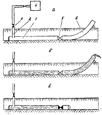 Рис.2. Принципиальная схема промывки без пропуска очистных или разделительных устройств: а - подготовка участка к проведению промывки; б - подача воды; в - подготовка участка к испытанию; 1 - очищаемый участок; 2 - подводящий патрубок; 3 - кран; 4 - наполнительные агрегаты; 5 - линейная арматура; 6 - сливной патрубок. 2.24. При промывке без пропуска очистного или разделительного устройства качество очистки обеспечивается скоростным потоком жидкости. 2.25. Принципиальная схема промывки без пропуска очистных и разделительных устройств приведена на рис. 2. 2.26. Скорость потока жидкости при промывке без пропуска очистных и разделительных устройств должна составлять не менее 5 км/ч. 2.27. Протяженность участков трубопроводов диаметром более 219 мм, промываемых без пропуска очистных или разделительных устройств, устанавливается с учетом гидравлических потерь напора в трубопроводе и располагаемого напора насосного оборудования. Оценку потерь напора в трубопроводе при промывке проводят по таблице рекомендуемого прил. 1. 2.28. Промывка без пропуска очистного или разделительного устройства считается законченной, когда из сливного патрубка выходит струя незагрязненной жидкости. Продувка 2.29. Продувку выполняют сжатым воздухом или природным газом, поступающим из ресивера (баллона), непосредственно от источника природного газа или высокопроизводительных компрессорных установок. Для продувки могут быть использованы также инертные газы, подводимые к трубопроводам от газовых установок промышленных предприятий. 2.30. Ресивер для продувки создается на прилегающем участке трубопровода, ограниченном с обеих сторон заглушками или запорной арматурой. При заполнении ресивера воздухом передвижные компрессорные станции можно использовать по одной или объединить их в группы. В последнем случае нагнетательные трубопроводы каждого компрессора подключают к коллектору, по которому воздух подают в ресивер.