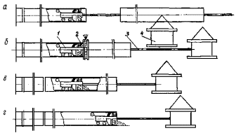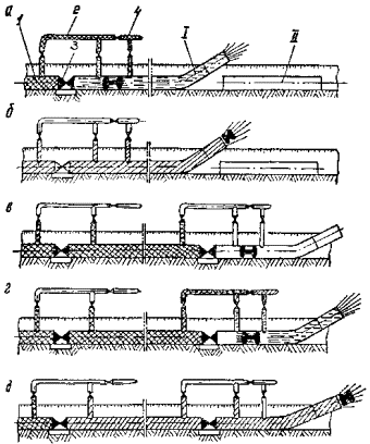 Рис.1. Принципиальная схема производства работ при промывке трубопроводов: а - подготовка участка к проведению промывки; б - подача воды перед поршнем-разделителем; в - пропуск поршня-разделителя в потоке воды; г - подготовка участка к испытанию; 1 - очищаемый участок; 2 и 7 - перепускные патрубки с кранами; 3 - поршень-разделитель; 4 - коллектор; 5 - наполнительные агрегаты; 6 - подводящий патрубок; 8 - линейная арматура; 9 -сливной патрубок.