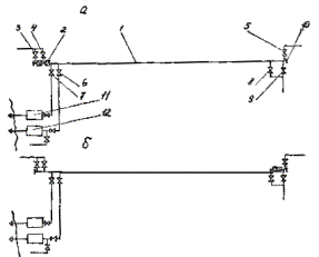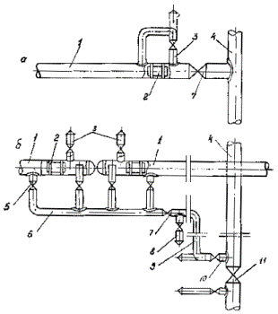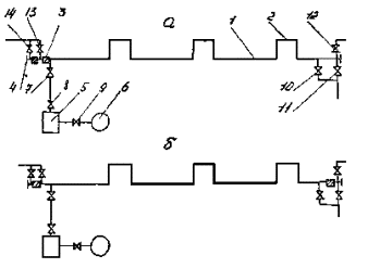 Рис. 5. Принципиальная схема подключения для отбора природного газа из действующих газопроводов: а - непосредственно на месте проектной вырезки газопровода-отвода в действующий газопровод, б - через свечу действующего газопровода и временный шлейф, подведенный к продуваемому участку; 1 - продуваемый участок; 2 - поршень; 3 - свеча на узле запасовки поршней; 4 - действующий газопровод; 5 - кран коллектора; 6 - коллектор; 7 - кран отключающий; 8 - свеча на шлейфе; 9 - шлейф; 10 - свеча на действующем газопроводе; II - линейный кран на действующем газопроводе. 2.36. Продувку промысловых трубопроводов осуществляют под давлением сжатого воздуха или газа в соответствии с принципиальными схемами, приведенными на рис. 6. 2.37. При продувке трубопроводов газом из них предварительно должен быть вытеснен воздух. Газ для вытеснения воздуха следует подавать под давлением не более 0,2 МПа (2 кгс/см2). Вытеснение воздуха считается законченным, когда содержание кислорода в газе, выходящем из трубопровода, составляет не более 2 %. Содержание кислорода определяют газоанализатором. 2.38. Подземные и наземные трубопроводы следует продувать с пропуском очистных поршней, оборудованных очистными и герметизирующими элементами. При этом скорость движения очистных поршней не должна превышать 70 км/ч. 2.39. Для продувки с пропуском поршня давление воздуха (или газа в ресивере при соотношении объемов ресивера и продуваемого участка 1:1) определяется по табл.1.