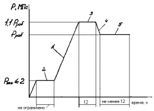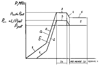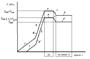 Рис. 9. График изменения давления при гидравлическом испытании трубопроводов (кроне магистральных нефтепроводов и нефтепродуктопроводов): 1 -