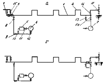 4.13. После гидравлического испытания участка газопровода запорная арматура на узле приема поршня-разделителя должна быть открыта только после полной готовности этого участка к удалению из него воды и получения извещения начале движения поршня-разделителя из узла пуска. Это предотвращает образованию воздушных пробок и снижает давление воздуха (газа), необходимое для удаления воды. 4.14. Из коротких участков трубопроводов категории В и I после их предварительного гидравлического испытания до укладки или крепления на опорах слив воды производится самотеком. 4.15. Принципиальные схемы инвентарных узлов пуска поршней-разделителей приведены на рис. 16. Указанные схемы узлов пуска обеспечивают производство работ, как при положительных, так и при отрицательных температурах. Технологические возможности схемы с универсальной обвязкой (рис. 16, а) выше, чем у схемы с раздельной подачей газа (воздуха) и воды (рис. 16, б). Она позволяет выполнять промывку с пропуском поршней, заполнение водой и предварительный прогрев трубопровода и окружающего грунта в условиях отрицательных температур, полное удаление воды после гидроиспытания с последовательным пропуском основного и контрольного поршня-разделителя. Установленный на конце трубопровода инвентарный узел используется для приема поршней-разделителей.