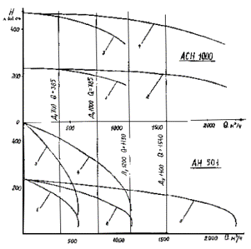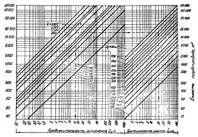 Рис. 1. Номограмма для расчета времени наполнения трубопровода водой или воздухом На оси абсцисс правой части номограммы находим точку, соответствующую L = 10 км, и от нее проводим вертикальную линию до пересечения с наклонной линией Dу = 500 мм. Из точки пересечения этих линий проводим горизонталь в левую часть номограммы до пересечения с наклонной линией Q = 300 м3/ч. Из полученной точки опускаем перпендикуляр на ось абсцисс и находим, что время наполнения tH равно 6,5 ч. Для определения времени заполнения трубопровода воздухом до создания давления Р (МПа) необходимо найденное время умножить на коэффициент К, равный создаваемому давлению Р, т.е. THP = 10×K×tH Выбор типа и количества наполнительных агрегатов В процессе наполнения трубопровода водой необходимо обеспечить: оптимальную скорость потока воды в трубопроводе, определяемую суммарной производительностью наполнительных агрегатов; возможность преодоления перепада высот по трассе с учетом сил трения и местных сопротивлений, определяемую развиваемым насосом напором. Выбор наполнительных агрегатов следует осуществлять с использованием характеристик насосов в следующей последовательности: определить максимально возможные потери напора (потребный напор) на участке трубопровода, подлежащем заполнению водой; задаться скоростью перемещения поршня по трубопроводу (расходом воды) в процессе заполнения полости водой; найти пересечение прямой, соответствующей заданному расходу воды, с характеристикой насоса; определить развиваемый насосом напор в точке пересечения прямой заданного расхода с характеристикой насоса; путем сравнения потребного и располагаемого напоров выбрать тип и количество наполнительных агрегатов. Потери напора на трение, отнесенные к I км трубопровода, в зависимости от его диаметра и расхода воды приведены в табл. прил.1. Характеристики наполнительных агрегатов приведены на рис. 2 прил. 1.