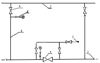 Рис. 3. Принципиальная схема предварительного испытания кранового узла природным газом: 1 - крановый узел; 2 - заглушка; 3 - свеча; 4 - перемычка; 5 - манометр; 6 - кран на перемычке; 7 - действующий газопровод 15. Необходимо соблюдать следующий порядок подачи газа в крановый узел (рис. 3 прил. 3): открыть запорную арматуру на крановом узле и свече; открыть кран у источника природного газа таким образом, чтобы, поддерживая давление не более 0,1-0,2 МПа (1-2 кгс/см2) обеспечить плавную подачу газа в испытываемый крановый узел с перемычками для полного вытеснения воздуха через свечу из всех коммуникаций и кранового узла. Определяемое газоанализатором содержание кислорода в выходящей из свечи газовоздушной смеси должно быть не более 2 %; закрыть кран на свече и осуществить подъем давления до испытательного. 16. Параметры и критерии оценки испытания на прочность и проверки на герметичность природным газом такие же, как при испытании сжатым воздухом. 17. В случае обнаружения утечек следует немедленно прекратить подачу газа и испытание, сбросить давление до 0,0002 - 0,0005 МПа (от 0,002 - 0,005 кгс/см2) и устранить дефекты с соблюдением требований к огневым работам. Рекомендуемое ОСНОВНЫЕ ПОЛОЖЕНИЯ ПО РАЗРАБОТКЕ СПЕЦИАЛЬНОЙ (РАБОЧЕЙ) ИНСТРУКЦИИ ПО ОЧИСТКЕ ПОЛОСТИ И ИСПЫТАНИЮ 1. Специальная (рабочая) инструкция по очистке полости и испытанию состоит из текстовой части, технологической схемы и графика производства работ. 2. В специальную рабочую инструкцию по ОПИУ (ОПИ) должны быть включены: титульный лист, в котором указано название данной инструкции с подписями председателя комиссии и представителей организаций, с которыми согласован этот документ; текстовая часть, содержащая: а) наименование испытываемого объекта (участка) с указанием его границ с привязкой к километровым, пикетным, реперным или другим знакам, предусмотренным рабочим проектом трубопровода; б) описание технологической схемы объекта (участка) в полном соответствии с исполнительной документацией, а также с указанием всех дополнительных соединений, врезок, арматуры, контрольно-измерительных приборов и т.д., выполненных специально для проведения ОПИ. Вся указанная в описании арматура и трубопроводы должны быть обозначены номерами, которые соответствуют номерам на рабочей схеме производства работ; в) перечисление отдельных участков производства ОПИ с указанием: границ этих участков; способов производства работ; методов ограничения (заглушки, арматура и т.п.); величины давления в конечных и контрольных точках; г) указание мест установки контрольно-измерительных приборов, их класс точности; д) перечень источников и средств для закачивания (воды, воздуха, газа, нефти и т.п.) с указанием их комплектации и производительности, а также описание схем подключения их к трубопроводу; е) описание технологии производства работ по ОПИ, в том числе: расчет потребности в средах (вода, воздух, газ, нефть и т.п.) для ОПИ с учетом резерва, необходимого для проведения дополнительных работ в случаях возникновения отказов; порядок и последовательность всех проводимых переключений и отключений арматуры на линейной части трубопроводов, а также на узлах подачи закачиваемых сред при выполнении всех этапов ОПИ, в том числе производства огневых работ и работ по ликвидации аварийных ситуаций; описание операции вытеснения из 