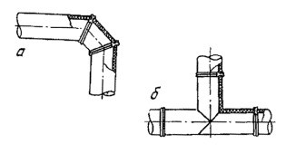 Рис. 5. Сварные стыковые соединения труб со сварными соединительными деталями: а - труб с угольником 90; б - труб с тройником Технологический процесс сварки включает в себя следующие этапы: нагрев (оплавление) свариваемых поверхностей; технологическую паузу, обусловленную необходимостью удаления нагретого инструмента; осадку стыка (при сварке встык) и вдвигание конца трубы в раструб детали (при сварке враструб); охлаждение сварного соединения. 7.5.3.3. Соединение труб и деталей из ПНД, ПВД и ПП следует производить контактной сваркой нагретым инструментом при температуре не ниже: +10 °С для труб из ПНД и ПВД и 0 °С - для труб из ПП. При более низких температурах сварку следует осуществлять в утепленных укрытиях. При работе на открытом воздухе место сварки следует защищать от ветра, атмосферных осадков, пыли и песка.
