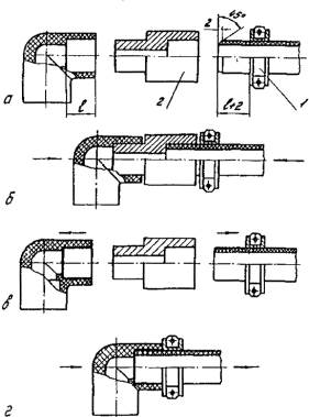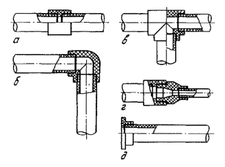 Рис. 4. Сварные стыковые соединения труб и соединительных деталей из ПНД: а - трубы с трубой; б, в - труб с угольниками соответственно 45° и 90°; г - труб с тройником; д - труб с переходом; е - трубы с втулкой под фланец 7.5.3.2. Контактная сварка заключается в нагревании (оплавленни) свариваемых поверхностей до вязкотекучего состояния термопласта при непосредственном контакте их с нагретым инструментом и последующим соединением под давлением. Оборудование для сварки приведено в приложении 2.