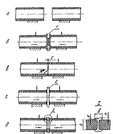 Рис. 7. Последовательность процесса контактной сварки встык труб из полиэтилена: а - центровка и закрепление в зажимах сварочного устройства концов свариваемых труб; б - механическая обработка торцов труб с помощью торцовки 1; в - проверка точности совпадения торцов по величине зазора С; г - нагрев (оплавление) свариваемых торцов с помощью нагретого инструмента 2; д - осадка стыка до образования сварного соединения (в сечении 1 даны основные геометрические размеры соединения встык, регламентированные п. 7.5.7.6.)