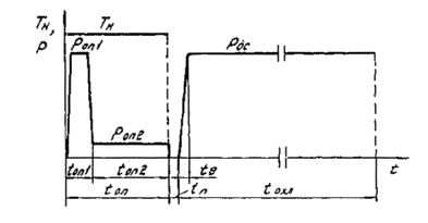 Рис. 8. Циклограмма процесса контактной сварки встык При точной подгонке торцов, если зазор (см. рис. 7, поз. в) в стыке не превышает 0,2 мм, допускается осуществлять оплавление в режиме постоянного давления, равного Роп.2 в течение времени, определяемого суммой tоп.1 и tоп.2. По окончании процесса оплапления отрыв нагретого инструмента следует производить в направлении, перпендикулярном оплавленной поверхности. На рабочих поверхностях нагревателя не должен оставаться расплав в виде пленки толщиной более 0,3 мм. Продолжительность технологической паузы, представляющей собой время между окончанием оплавления торцов и началом осадки стыка tп, не должна превышать значений, указанных в табл. 3 и 4. За время паузы оплавленные поверхности торцов не должны подвергаться воздействию влаги, ветра и пыли.