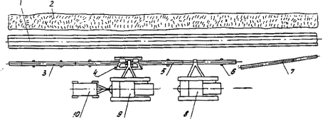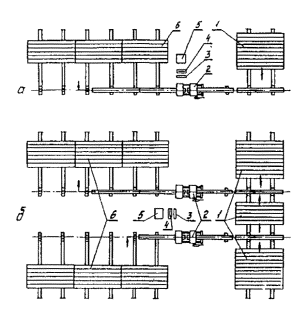 Рис.12. Схема организации сварочных постов при сварке трубных секций в стационарных условиях: а - с одним центратором; б - с двумя центраторами; 1 - место складирования труб; 2 - центратор; 3 - устройство для обработки торцов труб; 4 - нагревательный инструмент; 5 - блок питания; 6 - место складирования трубных секции