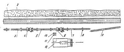 Рис. 13. Схема организаций сварочного поста при сварке трубопровода в непрерывную нитку с двумя центраторами: 1 - траншея; 2 - отвал грунта; 3 - свариваемый трубопровод; 4 - первый центратор; 5 - приваренная к трубопроводу секция; 6 - второй центратор; 7 - привариваемая секция; 8 - лежки ила инвентарные опоры; 9 - трубная секция; 10 - устройство для обработки торцов труб; 11 - нагревательный инструмент; 12 - передвижная электростанция на базе автомобиля трубные секции (или трубы) укладывают на подсыпной грунт, лежки или инвентарные опоры и выравнивает в линию; концы свариваемых трубных секций укрепляют в зажимах первого центратора, очищают от загрязнения, торцуют и сваривают согласно п. 7.5.3.5.; в процессе охлаждения стыка в зажимах первого центратора производят сборку и сварку следующего стыка с использованием второго центратора; первый центратор снимают с охлажденного стыка и перемещают для сборки и сварки последующего стыка, а в дальнейшем цикл повторяется. При сварке трубопроводов диаметром 225 мм и более для перемещения сварочного оборудования, подвозки и поддержания привариваемой трубы или секции следует использовать грузоподъемные машины (рис. 14). 7.5.6.8. Сварку захлестов производят в наиболее холодное время суток. Свариваемые концы трубопроводов сводят, размечают, обрезают с напуском 40-50 мм и укрепляют в зажимах центратора. При этом трубопровод, конец которого укрепляют в подвижном зажиме центратора, деформируют (оттягивают) в горизонтальной плоскости с образованием прогиба («змейки»), достаточного для требуемого перемещения зажима. Для уменьшения сил трения трубопровода при перемещении подвижного зажима под трубопровод подкладывают катушки из обрезков труб, бревен и т.д. 7.5.6.9. В процессе монтажа концы трубопроводов с втулками под фланец следует закрывать заглушками или чехлами для защиты от механических повреждений и засорения трубопровода. При производстве сборочных и сварочных работ следует пользоваться инвентарными монтажными опорами. 7.5.7. Контроль качества сварных соединений 7.5.7.1. При строительстве трубопроводов для качественного выполнения сварочных работ производят: а) технический осмотр сварочных устройств (нагревательного инструмента, сварочного центратора, торцовки, блока питания); б) входной контроль качества применяемых материалов и изделий;
