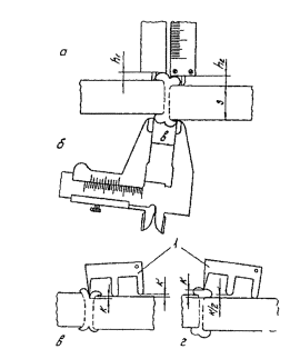 Рис.15. Схема измерения параметров стыкового соединения: а - высота валиков грата h1, h2; б - ширина грата b; в, г - величина усиления К (случай «в» - брак); 1 - приспособление для определения К с помощью щупа в) угол излома продольной оси трубы и приваренной к ней соединительной детали не должен превышать 10°. 7.5.7.9. Стыковые соединения, не удовлетворяющие требованиям п. 7.5.7.6. и раструбные соединения – требованиям п. 7.5.7.8, бракуют. Стыковые соединения, забракованные при визуальном контроле, исправлению не подлежат; они должны быть вырезаны, после выявления и устранения причин появления брака сварены вновь либо на их место должны быть вварены катушки длиной не менее 200 мм. В дефектном раструбном соединении следует вырезать соединительную деталь и приварить новую. Если необходимо удлинить укороченную при резке трубу, к ней следует приварить катушку длиной не менее 200 мм. 7.5.7.10. Разрушающий контроль качества сварных соединений путем механических испытаний производят: а) на пробных соединениях, свариваемых при настройке сварочного оборудования, при уточнении режимов сварки новой партии или сортамента труб; б) на допускных соединениях, свариваемых в соответствии с п. 3.2; в) на контрольных соединениях, отбираемых для контроля в процессе сварки трубопроводов по требованию заказчика или в соответствии с требованиями проекта в количестве не более 1 % от сваренных соединений. В качестве контрольных соединений следует выбирать сварные стыковые и раструбные соединения, наихудшие по внешнему виду. Механические испытания производят в соответствии с пп. 7.5.1.6-7.5.1.10, 7.5.1.12. 7.5.7.11. Если результаты механических испытаний контрольного стыкового или раструбного соединения не удовлетворяют требованиям пп. 7.5.1.11, 7.5.1.13, из нитки трубопровода вырезают удвоенное число соединений, которое вновь подвергают механическим испытаниям. При получении неудовлетворительных результатов испытаний, хотя бы одного из дополнительных контрольных соединений, необходимо: а) сварку прекратить и установить причину получения некачественных соединений; работа может быть продолжена тем же сварщиком и на той же установке только после устранения причини брака и получения удовлетворительных результатов испытания дополнительно сваренного допускного соединения в соответствии с п. 7.5.1.3; если причиной брака является низкая квалификация сварщика, то его отстраняют от сварки полиэтиленовых трубопроводов; б) все стыки, сваренные сварщиком с момента последних механических испытаний, подвергнуть повторному визуальному контролю и измерениям; соединения, не удовлетворяющие требованиям пп. 7.5.7.6, 7.5.7.8, должны быть вырезаны и заварены вновь. 7.5.7.12. Результаты контроля и испытаний должны быть оформлены в соответствии с действующими нормами исполнительной производственной документации. 7.6. Укладка и закрепление трубопровода 7.6.1. Работы по укладке плетей трубопровода необходимо производить не ранее, чем через 10 ч после завершения сварочных работ. 7.6.2. Укладку трубопровода в летний период следует осуществлять при наиболее низких температурах (либо в холодные дни, либо в утренние часы). Если эти условия не могут быть выполнены, трубопровод укладывают змейкой по ширине траншеи или предусматривают технологические разрывы в нем, которые должны быть спарены после укладки трубопровода в проект