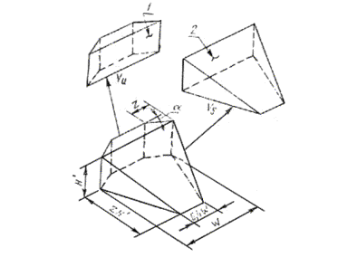 т.е. 3.1.4. Эффективный контур отвала - упрощенное изображение передней поверхности отвала в виде вертикальной плоскости с размерами W и H¢ (см. черт. 3), применяемое для вычисления объема призмы волочения. 3.2. Бульдозерное оборудование с полусферическим и сферическим отвалами 3.2.1. Площадь проекции отвала Аm - то же, что для прямого неповоротного отвала (п. 3.1.1). 3.2.2. Длина отвала W - то же, что для прямого неповоротного отвала (п. 3.1.2). 3.2.3. Эффективная высота отвала H¢ - то же, что для прямого неповоротного отвала (п. 3.1.3). 3.2.4. Эффективный контур отвала - упрощенное изображение передней поверхности отвала, применяемое для вычисления объема призмы волочения. Образуется пересекающимися вертикальными плоскостями, проходящими через режущую кромку отвала на уровне GRP при установке отвала в среднее по углу наклона положение. Фронтальные размеры W и Н¢ (см. черт. 4). 3.2.5. Угол установки боковой части отвала a - угол в градусах, измеряемый у режущей кромки отвала, находящейся на GRP, при среднем по углу наклона положении отвала. Угол определяет направление пересекающихся плоскостей, образующих эффективный контур отвала (см. черт. 4). 3.2.6. Длина боковой части отвала Z - длина в метрах боковой части отвала, измеряемая параллельно длине отвала (см. черт. 4). 3.3. Бульдозерное оборудование с поворотным отвалом, установленным в прямое положение 3.3.1. Длина отвала W - длина в метрах отвала (см. черт. 5). 3.3.2. Эффективная высота отвала Н¢ - высота в метрах по вертикали при установке отвала в среднее по углу наклона положение (см. черт. 5). 3.3.3. Эффективный контур отвала - упрощенное изображение передней поверхности отвала в виде вертикальной плоскости с размерами W и H¢ (см. черт. 5), применяемое для вычисления объема призмы волочения. 4. УСЛОВНЫЕ ОБОЗНАЧЕНИЯ И ФОРМУЛЫ ДЛЯ ВЫЧИСЛЕНИЯ ОБЪЕМА ПРИЗМЫ ВОЛОЧЕНИЯ4.1. Условные обозначения Vs - объем призмы волочения для прямого, поворотного, полусферического и сферического отвалов, вычисленный с использованием упрощенного изображения передней поверхности отвала по черт. 3 и 4. Vu - объем контура полусферического и сферического отвалов, учитывающий угол установки и длину их боковых частей (см. черт. 6). V1 - объем призмы волочения прямого и поворотного отвалов. V2 - объем призмы волочения полусферического и сферического отвалов. 4.2. Формулы для вычисления объема призмы волочения. Объем призмы волочения, выраженный в кубических метрах, вычисляют в соответствии с черт. 6 по следующим формулам. 4.2.1. Объем призмы волочения неповоротного (прямого) и поворотного отвалов. V1 = Vs, Vs = 0,8 W (H¢)2. 4.2.2. Объем призмы волочения полусферического и сферического отвалов. V2 = Vs + Vu, Vs = 0,8 W (H¢)2,