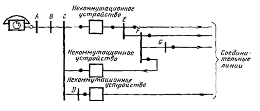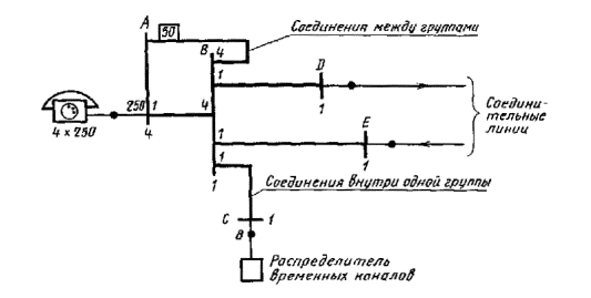 (Измененная редакция, Изм. № 1). Справочное ПРИМЕРЫ ЭЛЕКТРИЧЕСКИХ СТРУКТУРНЫХ СХЕМ КОММУТАЦИОННЫХ СИСТЕМ Система коммутационная, содержащая две маркируемые коммутационные ступени AВС или ABCD и Е, EF или EFG, соединенные через некоммутационное устройство. Соединения осуществляются следующим образом: входящие - через DCBA; внутристанционные - через АВС, ЕF и СВА; исходящие - через АВС и либо Е, либо EF, либо EFG. Система коммутационная с тремя ступенями искания. А - ступень предварительного искания; В или ВС - ступень группового искания; D - ступень линейного искания Многоканальная система передач с временным разделением каналов, в которой 1000 абонентских линий разделены следующим образом: четыре группы по 250 линий; 50 временных каналов; 8 распределителей временных каналов, общих для всей системы. Соединения между абонентами разных групп осуществляют через три звена коммутации AВС. Соединения между абонентами внутри одной группы осуществляют через шесть звеньев коммутации: АВС - распределитель временных каналов СВА. Внешние соединения осуществляют через три звена коммутации: ABD - исходящие; ЕВА - входящие. |