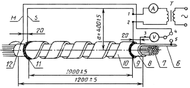 1 и 2 - токовые зажимы; 3, 4 и 5 - потенциальные зажимы; 6 - любая измеряемая жила кабеля, 7 -остальные жилы кабеля, изолированные друг от друга и от кабельной оболочки; 8 - металлическая оболочка; 9 и 11 - кольцевые электроды; 10 - броня, S - токовый провод; М - измерительный провод, изолированный от токового провода S; 12 - точка соединения измеряемой жилы 6 с измерительным проводом М и оболочкой 8; а - аксиальное расстояние между продольной осью кабеля и токовым проводом S; T - регулируемый трансформатор для высоких токовых нагрузок Черт. 2 8.1.3. Погрешность измерительной установки должна быть не более 10 %. 8.2. Подготовка к измерениям 8.2.1. Подготовка кабелей к измерениям должна проводиться в соответствии с требованиями пп. 1.2 и 3.2.2. 8.3. Проведение измерений 8.3.1. Ток, имитирующий внешние помехи на кабель, должен подводиться к металлическим покровам кабеля (оболочке, броне и дополнительным металлическим элементам) и быть регулируемым так, чтобы можно было установить регламентированное нормативно-технической документацией на кабель напряжение на металлических покровах UH = U3,4. При этом необходимо, чтобы к точкам 1 и 2 для всех применяемых нагрузок прикладывалось синусоидальное напряжение. Кривая напряжения считается синусоидальной, если ни одно из ее мгновенных значений не отличается от мгновенных значений той же фазы основной волны (первой гармоники) более чем на 10 %. 8.3.2. Ток от трансформатора (T) должен подводиться к кольцевым электродам кабеля. Кольцевые электроды из медной проволоки должны иметь хороший электрический контакт со всеми элементами металлических покровов. Сечение кольцевых электродов должно быть приблизительно 20 мм2. Провод (S) и измерительный провод (М) (черт. 2) должны быть расположены близко друг от друга, так, чтобы они вместе с отрезком кабеля образовывали два прямоугольных контура (контур «кабельная оболочка - токовый провод» и контур «кабельная оболочка - измерительный провод»), взаимоиндукция которых воспроизводит наружную индуктивность кабеля, проложенного в земле. Величина индуктивности должна быть порядка 2 мГн, пересчитанная на длину 1 км, если в нормативно-технической документации на кабели не указаны другие требования. Такая величина индуктивности получается при аксиальном расстоянии а = 400 мм (от продольной оси кабеля до токового провода) для шлейфа измерительного устройства. В качестве провода (S) для малых сил тока может быть применена 19-проволочная медная жила минимальным сечением 50 мм2, у которой в наружном повиве имеется одна медная изолированная жила, применяемая в качестве измерительного провода. При больших силах тока токовый провод может состоять из двух параллельно расположенных плоских медных шин, расстояние между которыми приблизительно должно быть равно толщине шины. Между шинами располагается изолированный измерительный провод (М). Аксиальное расстояние (а) в этом случае выбирают таким, чтобы индуктивность шлейфа была порядка 2 мГн, пересчитанная на длину 1 км. Измеряемая жила кабеля должна быть соединена с точкой 5 на одном конце образца кабеля и с точкой 12 на другом конце, причем соединение с точкой 12 должно быть произведено кратчайшим путем. Все остальные жилы должны быть изолированы друг от друга и от металлических элементов покровов. 8.3.3. С помощью измерительного устройства должны быть измерены напря