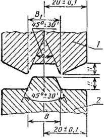 Черт. 1 ПРИЛОЖЕНИЕ 3Обязательное МЕТОД ОПРЕДЕЛЕНИЯ СОПРОТИВЛЕНИЯ РАЗРЫВУ ПО ЛИНИИ РИЛЕВКИМетод определения сопротивления разрыву по линии рилевки заключается в определении силы, вызывающей разрушение образца картона после выполнения одного двойного перегиба на 180° по линии рилевки. 1. Средства испытаний 1.1. Устройство для рилевания образцов гофрированного картона, изготовленного по НТД, разработанной в установленном порядке, состоящее из рилевочной части (черт. 2), на которую устанавливаются муфты для рилевания или смятия гофров по линии рилевки 1, 2, и устройства 3, позволяющего устанавливать зазор между муфтами от 0 до 10 мм. Рилевочная часть устройства должна обеспечивать свободный съем и установку муфт, их центрирование в вертикальной плоскости относительно друг друга. Привод устройства 4 должен обеспечивать рилевание образцов картона с линейной скоростью от 10 до 150 м/мин. Устройство для рилевания 1, 2 - муфты для рилевания (или смятия); 3 - устройство для регулирования зазора между муфтами; 4 - привод с устройством для регулирования скорости рилевания Черт. 2 Размеры поверхностей муфт для рилевания должны соответствовать табл. 5 и черт. 3, для смятия гофров - черт. 4.