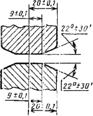 Размеры рабочих поверхностей муфт для рилевания гофрированного картона 1 - муфта с выемкой; 2 - муфта с выступом Размеры рабочих поверхностей муфт для смятия гофров Черт. 4 1.2. Разрывные машины, отвечающие требованиям ГОСТ 13525.1, с нагрузкой от 200 до 2500 Н, обеспечивающие расстояния между зажимами: (150±1) мм; (100±1) мм; (50±1) мм. 1.3. Ножи с ограничителями для нарезания образцов картона длиной (50±1)-(250±1) мм и шириной (25±1)-(50±1) мм, обеспечивающие параллельность сторон и чистоту обреза кромок. 1.4. Толщиномеры, отвечающие требованиям ГОСТ 22186 и ГОСТ 27015. 2. Подготовка к испытанию Из отобранных проб вырезают 20 образцов длиной (250±1) мм, шириной (200±1) мм так, чтобы продольная кромка картона была перпендикулярна направлению гофров. Образцы должны быть без вмятин, расклеенных участков и разрывов плоских слоев картона, с ровными кромками обреза. Образцы нумеруют и определяют толщину по ГОСТ 22165. Устанавливают расстояние между зажимами разрывной машины, равное 150 мм. Допускается устанавливать расстояние в 100 или 50 мм, при этом линия рилевки на полоске должна находиться от центра между зажимами на расстоянии не более 10 мм. Скорость испытания подбирают так, чтобы разрыв образцов наступил через (120±15) с от начала нагружения. 3. Проведение испытания Испытания проводят в условиях, соответствующих требованиям п. 4.2. Нанесение линий рилевок проводят в следующей последовательности. На рилевочную часть устройства устанавливают комплект муфт для смятия гофров с зазором между ними не более 0,5 толщины картона, подвергаемого испытанию, и проводят смятие гофров в картоне по линии рилевки. Толщину картона по линии смятия определяют по ГОСТ 27015. Допускается не проводить смятие гофров перед рилеванием у образцов картона типа Т, если на плоские слои картона использованы картон или бумага для гофрирования с числом двойных перегибов не менее 50. После снятия муфт с плоскими поверхностями на рилевочную часть устройства устанавливают комплект муфт для рилевания с зазором между ними, равным толщине картона по линии смятия в сочетании: верхняя - с выемкой; нижняя-с выступом (черт. 3). Выбор комплекта муфт проводят в соответствии с табл. 6. Таблица 6