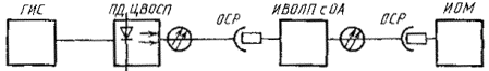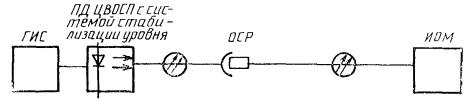 * При измерении уровней мощности излучателей применяют фильтр мод. ** В состав ГИС введен модулятор фазовых дрожаний (МФД). *** Выход сигнала симметричный. **** ИФД может быть реализован в ГИС. ***** ИКО возможно объединить с ГИС. 1.2. Измерительные приборы и вспомогательные устройства должны быть аттестованы в соответствии с ГОСТ 8.002 и ГОСТ 8.326. 1.3. Допускается изготовлять средства измерения на предприятиях - изготовителях ЦВОСП с последующей их аттестацией по ГОСТ 22261. 2. ПОДГОТОВКА К ИЗМЕРЕНИЯМПараметры ЦВОСП измеряют в нормальных климатических условиях по ГОСТ 15150. Напряжение питания средств измерений - по ГОСТ 22261. 3. ПРОВЕДЕНИЕ ИЗМЕРЕНИЙ3.1. Измерение уровня средней мощности оптического излучения ПД ЦВОСП 3.1.1. Метод основан на использовании измерителя оптической мощности, работающего на поглощение мощности. 3.1.2. Измерения проводят по схеме, приведенной на черт. 1. 3.1.3. На ГИС устанавливают сигнал ПСП, структура которого соответствует сигналу на входе ПД ЦВОСП в соответствии с требованиями технических условий (ТУ) на ПД ЦВОСП. По показаниям ИОМ измеряют уровень оптической мощности сигнала 1-го измерения Рi для значения сигналов ПСП. 3.1.4. Уровень оптической мощности (Р) вычисляют по формулам: