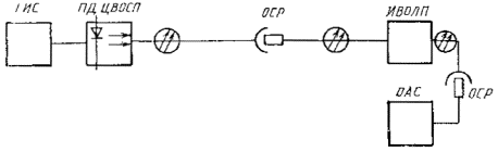 где DФ - погрешность измерения фазового дрожания сигнала; Фср - среднее фазовое дрожание сигнала при пяти измерениях и более с интервалом 3 мин. 3.5. Измерение длины волны и ширины огибающей спектра оптического излучения на выходе регенерационного участка 3.5.1. Метод основан на сравнении измеренных оптических характеристик на выходе ЛТ с заданными в ТУ. 3.5.2. Длину волны и ширину огибающей спектра оптического излучения измеряют по схемам черт 5, 6. 3.5.3. По схеме, приведенной на черт. 5, измеряют длину волны и ширину огибающей спектра оптического излучения на выходе ПД ЦВОСП. Для этого на ГИС устанавливают сигналы, соответствующие передаваемым по измеряемому ЛТ, и по показаниям ОАС определяют значения длины и ширины огибающей спектра оптического излучения на выходе ПД ЦВОСП. Нормируемые параметры спектра определяются в соответствии с требованиями ТУ на конкретный тип аппаратуры регенерационного участка. 3.5.4. Затем подключают ИВОЛП по схеме, приведенной на черт. 6, измеряют длины волн и ширину огибающей спектра оптического излучения на выходе линейного тракта при тех же значениях сигналов, установленных в п. 3.1.2. 3.5.5. Не изменяя показаний ГИС, по показаниям ОАС измеряют ширину огибающей спектра оптического излучения аппаратуры ЛТ. 4. ОБРАБОТКА РЕЗУЛЬТАТОВ4.1. В результаты измерений должны быть внесены поправки, которые складываются из алгебраических погрешностей, указанных в свидетельствах о поверке каждого из приборов и вносимых потерь OCP. 4.2. Характеристики выходной мощности ПД ЦВОСП порога чувствительности ПР ЦВОСП с регенератором при заданных коэффициенте ошибок, фазовом дрожании, ширине огибающей спектра и дисперсионных искажениях должны быть представлены в виде графиков или таблиц. ИНФОРМАЦИОННЫЕ ДАННЫЕ 1. РАЗРАБОТЧИКИ В.Д. Лиференко, канд. техн. наук (руководитель темы); И.А. Лукин, канд. техн. наук; Ю.В. Марков, канд. техн. наук; А.И. Колосов; В.А. Бирюков; П.В. Гладков 2. УТВЕРЖДЕН И ВВЕДЕН В ДЕЙСТВИЕ Постановлением Государственного комитета СССР по управлению качеством продукции и стандартам от 29.12.90 № 3704 3. СРОК ПЕРВОЙ ПРОВЕРКИ - 1996 г., периодичность проверки - 5 лет 4. Стандарт соответствует рекомендациям МККТТ G651, G652, G703, G821, G823, G956, 0.171 5. ВВЕДЕН ВПЕРВЫЕ 6. ССЫЛОЧНЫЕ НОРМАТИВНО-ТЕХНИЧЕСКИЕ ДОКУМЕНТЫ