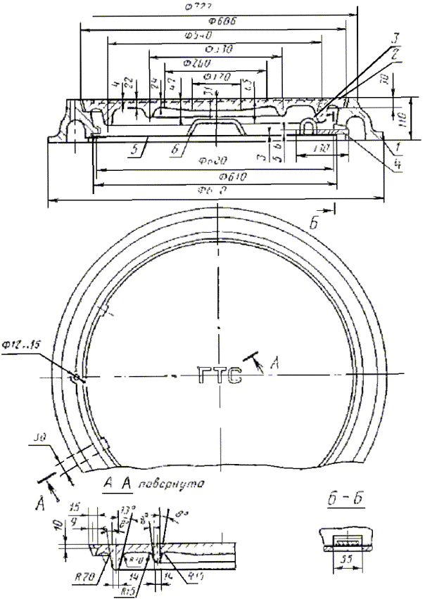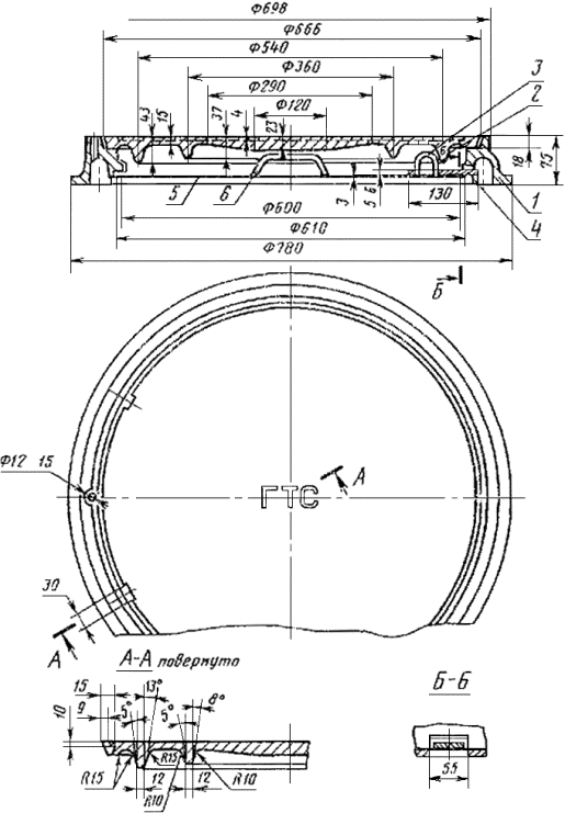 1 - корпус; 2 - верхняя крышка; 3 - скоба; 4 - планка запора; 5 - нижняя крышка; 6 - ручка Люк типа Л 1 - корпус; 2 - верхняя крышка; 3 - скоба; 4 - планка запора; 5 - нижняя крышка; 6 - ручка Условное обозначение люка тяжелого: Люк Т ГОСТ 8591-76 То же, люка легкого: Люк Л ГОСТ 8591-76 2. ТЕХНИЧЕСКИЕ ТРЕБОВАНИЯ2.1. Люки должны изготовляться в соответствии с требованиями настоящего стандарта и технической документации, утвержденной в установленном порядке, люки, предназначенные на экспорт, - кроме того, в соответствии с заказ-нарядом внешнеторговой организации. (Измененная редакция, Изм. № 1). 2.2. Детали люка должны изготовляться: а) корпус и крышка (наружная) - из чугуна марки не ниже СЧ10 по ГОСТ 1412-85; б) крышка (внутренняя) и остальные детали - из сортовой (круглой, полосовой и листовой) стали марки Ст3 или Ст3кп по ГОСТ 380-88. 2.3. Предельные отклонения по размерам и масса отливок из чугуна должны соответствовать 3-му классу точности по ГОСТ 26645-85. При этом зазор между верхней крышкой и корпусом не должен превышать 3 мм на сторону. (Измененная редакция, Изм. № 1). 2.4. Чугунные детали не должны иметь дефектов литья, снижающих прочность и товарный вид изделия: раковин глубиной более 2 мм, размером в плане более 3 мм, в количестве больше 2 на 1 дм2 отливки; спай глубиной более 2 мм, длиной более 300 мм; стрелу прогиба в центре верхней крышки более 5 мм; смещение рисунка верхней крышки более чем на 5 мм; заливы более 2 мм. 2.5. Наружная крышка должна свободно, без нажима, входить в корпус люка, плотно прилегать к его опорной кольцевой поверхности. В корпусе должны быть отверстия для проверки загазованности колодца без снятия крышек. 2.6. Верхняя поверхность наружной крышки должна быть рельефной; высота рельефа рисунка не должна быть более 4 мм. 2.7. Наружная крышка должна иметь две впадины под углом 60°, предназначенные для удобства открывания. 2.8. Внутренняя крышка должна свободно, без нажима, вкладываться в корпус люка, а запорная планка - на скобу внутренней крышки и запирать ее в корпусе люка. 2.9. Внутренняя крышка и запорная планка должны быть покрыты лаком БТ-577 по ГОСТ 5631-79 или другим покрытием, обеспечивающим надежную защиту их от коррозии в условиях эксплуатации, установленных настоящим стандартом. При поставке на экспорт люки должны иметь покрытие класса УI по ГОСТ 9.032-74 эмалью ПФ-115 по ГОСТ 6465-76: черного цвета - для поставки в страны с тропическим климатом и черного или серого цвета - для поставки в страны с умеренным или холодным климатом или другим покрытием, обеспечивающим надежную защиту от коррозии. Условия эксплуатации покрытия должны соответствовать ГОСТ 9.104-79 группе ТI - для поставки в страны с тропическим климатом и группе УХЛ1 - для поставки в страны с умеренным и холодным климатом. (Измененная редакция, Изм. № 1). 2.10. В соответствии с нормами вертикальных нагрузок для расчета искусственных сооружений на автомобильных дорогах нормативная нагрузка не должна превышать: 100 × 103Н (10,2 тс) - для люка типа Т; 29 × 103Н (3,0 тс) - для люка типа Л; а соответствующая ей расчетная нагрузка не должна превышать: 110 × 103 (11,3 тс) - для люка типа Т; 44 × 103 (4,5 тс) - для люка типа Л. 2.11. В зависимости от марки используемого чугуна (его удельного веса) номинальное значение массы люка должно соответствовать: 138 - 147 кг - для люков типа Т, 82 - 87 кг - для люков типа Л. Масса наружной крышки люка приведена в справочном приложении. (Изме