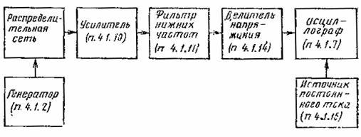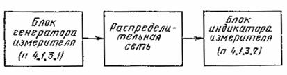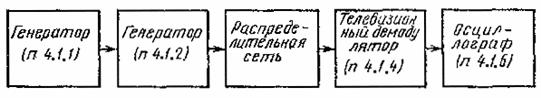 Черт. 2 На вход распределительной сети от блока генератора измерителя амплитудно-частотных характеристик (п. 4.1.3.1) подают сигнал качающейся частоты в полосе частот соответствующего канала, приема или в диапазоне УКВ ЧМ вещания. Органами управления блока индикатора измерителя амплитудно-частотных характеристик (п. 4.1.3.2) устанавливают режим устойчивого слежения за частотой измеряемого сигнала. На экране индикатора измерителя измеряют и выражают в децибелах отношение максимального уровня амплитудно-частотной характеристики к ее минимальному уровню в полосе частот между несущими изображения и звукового сопровождения канала распределения или в диапазоне УКВ ЧМ вещания. При использовании блока индикатора измерителя с цифровым отсчетом последовательно через, 0,5-1,0 МГц измеряют уровни сигнала в указанной полосе частот или в диапазоне УКВ ЧМ вещания, отмечают максимальное и минимальное значение и определяют по ним неравномерность амплитудно-частотной характеристики. Если активные элементы распределительной сети имеют автоматическую регулировку усиления по уровню принимаемого сигнала, измерение повторяют при минимальном и максимальном значениях входного уровня сети. Примечание. При отсутствии измерителя амплитудно-частотных характеристик с раздельными блоками генератора и индикатора допускается измерять амплитудно-частотную характеристику сети по точкам с помощью генератора (п. 4.1.2) и селективного микровольтметра (п. 4.1.5). 4.3.3. Измерение импульсной характеристики (п. 7, табл. 2) проводят по структурной схеме черт. 3.