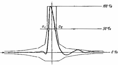 Черт. 3 На вход распределительной сети от генератора (п. 4.1.2) подают напряжение несущей изображения канала приема, модулированной периодическим измерительным сигналом № 2 от генератора (п. 4.1.1), содержащим 2Т-импульс (элемент В1), при коэффициенте амплитудной модуляции 50%. Телевизионный демодулятор (п. 4.1.4), подключенный к выходу абонентской розетки, настраивают на прием радиосигнала изображения в канале распределения. Размах полного телевизионного сигнала на выходе демодулятора устанавливают равным 0,5-1 В. Измерение импульсной характеристики проводят по синусквадратичному 2Т-импульсу, осциллограмму которого устанавливают в центре экрана осциллографа (п. 4.1.6) таким образом, чтобы уровень черного совпал с осью горизонтальной развертки осциллографа (0%), вершина импульса - с уровнем, принимаемым за единицу (100%), а точки a1 и а2 располагались симметрично относительно вертикальной оси, проходящей через нулевую точку оси времени (черт. 4).