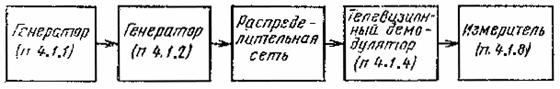Черт. 5 На вход распределительной сети с выхода генератора (п. 4.1.2) подают напряжение несущей изображения канала приема, модулированное полным телевизионным сигналом от генератора (п. 4.1.1) с введенными измерительными сигналами I-IV испытательных строк (в активной части поля - сигнал № 2). Уровень радиосигнала изображения на входе распределительной сети устанавливают равным максимальному значению входного уровня сети. Телевизионный демодулятор (п. 4.1.4), подключенный к выходу абонентской розетки, настраивают на прием радиосигнала изображения в канале распределения, размах полного телевизионного сигнала на выходе демодулятора устанавливают равным 1 В. В соответствии с инструкцией по эксплуатации измерителя (п. 4.1.8) измеряют в процентах относительно размаха условной цветовой поднесущей на уровне гашения ее максимальные отклонения от этого размаха в сторону больших и меньших значений. Искомое дифференциальное усиление находят суммированием модулей двух измеренных значений. Затем измеряют наибольшие положительную и отрицательную разности фаз цветовой поднесущей на разных уровнях сигнала яркости и на уровне гашения. Искомую дифференциальную фазу находят суммированием модулей двух измеренных разностей фаз. При измерении отношения сигнала к шуму уровень радиосигнала изображения на входе распределительной сети уменьшают до минимального значения входного уровня. С помощью измерителя (п. 4.1.8) измеряют в децибелах отношение размаха сигнала яркости (от уровня черного до уровня белого) к эффективному значению напряжения взвешенного шума. Отношение эффективного значения напряжения несущей изображения к эффективному значению напряжения шума определяют уменьшением полученного результата измерения на 3 дБ. Примечания: 1. До проведения измерений рекомендуется убедиться в том, что параметры комплекта аппаратуры генератор (п. 4.1.2) - телевизионный демодулятор (п. 4.1.4), измеренные по приведенной методике, не хуже следующих: К-фактор - не более 3%, дифференциальное усиление - не более 4%, дифференциальная фаза - не более 4°, отношение сигнала к шуму, измеренное при подаче на вход демодулятора радиосигнала изображения уровнем 2 мВ, - не менее 50 дБ. 2. Если уровень радиосигнала изображения на выходе абонентской розетки меньше 2 мВ, измерение отношения сигнала к шуму следует проводить в линии домовой распределительной сети с соблюдением требований п. 4.2.4 настоящего стандарта. 4.3.5. Измерение отношения сигнала к фоновой помехе (п. 11, табл. 2) проводят по структурной схеме черт 6.