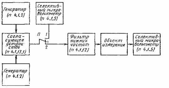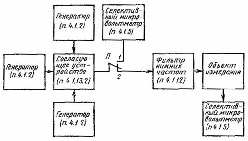 где Uп - наибольшее из двух измеренных значений Uп1 и Uп2. Если в диапазонном (широполосном) усилителе используется более двух каналов, то подаваемые на вход магистральной сети напряжения увеличивают на К дБ K=7,5 lg(n-1), где п - число используемых в усилителе каналов. Измерения повторяют, подавая сигналы на частотах f1 и f2 в полосы частот других используемых сигналов. За отношение сигнала к помехе комбинационной частоты принимают наименьшее из полученных значений. 4.3.6.3. Измерение отношения сигнала к помехе комбинационной частоты второго порядка в распределительных сетях, содержащих диапазонные или широкополосные усилители (п. 12в, табл. 2), проводят по структурной схеме черт. 10.