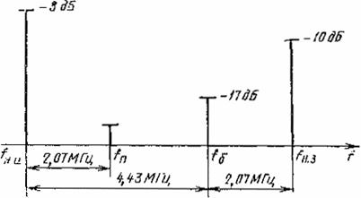 Черт. 9 Селективным микровольтметром (п. 4.1.5), подключенным к выходу абонентской розетки, измеряют напряжение несущей изображения Uн.и на частоте fн.и и напряжения помех Uп1 и Uп2 на частотах fн.и +2 МГц и fн.и -2 МГц соответственно. Отношение сигнала к помехе комбинационной частоты третьего порядка в сети с диапазонными или широкополосными усилителями, выраженное в децибелах, определяют по формуле