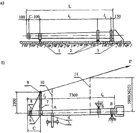1 - шарнирно-скользящая опора; 2 - шарнирно-неподвижные опоры; 3 - упор в торце; 4 - измерительная рейка; 5 - неподвижный репер; 6 - стальные хомуты; 7 - прямая консоль; 8 - тяга; 9 - трос; 10 - уровень контактного провода; 11 - уровень условного обреза фундамента; Р - усилие натяжения при испытании; А, Б и В - места замера перемещений; С - расстояние между осями хомутов пяты и тяги консоли; L - общая длина стойки; l1 - расстояние между центрами опор; l2 - расстояние между центрами упоров в фундаментной части; l3 - расстояние от верхнего торца стойки до уровня контактного провода; l4 - расстояние от уровня условного обреза фундамента до нижнего торца стойки. При испытании стоек ССА упоры 2 убираются, стойки закрепляются анкерными болтами в месте расположения упора 3. Размер в скобках относится к стойкам длиной 15600 мм. Рисунок 2 - Схема испытаний стойки а - расположение опор по длине стойки (вид сбоку); б - схема приложения нагрузки (вид сверху) 6.1.3 Величины контрольных нагрузок (усилий натяжения троса при испытаниях стоек) Р, определенные с учетом коэффициентов безопасности С в соответствии с ГОСТ 8829, указаны в таблице 6. Таблица 6