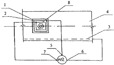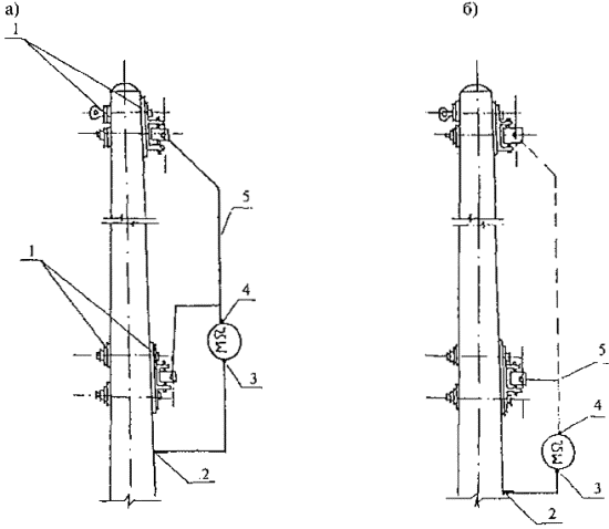 6.1.4 Нагрузку к испытываемой стойке прикладывают ступенями, указанными в приложении В. До начала испытаний следует произвести обжатие испытательной системы нагрузкой, соответствующей не более 0,1 Мн (нормативного изгибающего момента). Стойку выдерживают 10 мин после приложения каждой ступени нагрузки до значения, соответствующего 1,0 Мн. После приложения контрольной нагрузки по проверке жесткости и трещиностойкости, соответствующей 1,0 Мн, стойку выдерживают под этой нагрузкой в течение 30 мин. При нагрузке, соответствующей 1,1 Мн и более, стойку выдерживают 5 мин после приложения каждой ступени нагрузки до полного разрушения стойки. Величину усилия натяжения троса при испытаниях следует устанавливать по динамометру, удовлетворяющему требованиям ГОСТ 13837. 6.1.5 Определение величины прогиба стойки в плоскости приложения нагрузки выполняют с точностью до 1 мм для каждой ступени нагрузки в точке А, указанной на рисунке 2, с учетом перемещений в точках Б и В. 6.1.6 При испытаниях по жесткости контрольный прогиб стоек под действием контрольной нагрузки по проверке жесткости принимают равным, мм: 100 - для стоек с нормативным изгибающим моментом до 88 кН×м (9 тс×м) включительно; 125 - для стоек с нормативным изгибающим моментом свыше 88 кН×м (9 тс×м). 6.2 Прочность бетона стоек на сжатие следует определять по ГОСТ 10180 на серии образцов, изготовленных из бетонной смеси рабочего состава и хранившихся в условиях, установленных ГОСТ 18105. Допускается контроль прочности центрифугированного бетона осуществлять по результатам испытаний вибрированных эталонных образцов-кубов после их термовлажностной обработки паром. Результаты испытаний учитываются с повышающим коэффициентом перехода, равным 1,25. При проверке прочности бетона методами неразрушающего контроля фактическую отпускную прочность бетона на сжатие определяют ультразвуковым методом по ГОСТ 17624 или приборами механического действия по ГОСТ 22690. Допускается применение других стандартизованных методов неразрушающего контроля. На каждом участке проводят не менее одной группы измерений. При применении ультразвукового метода должно осуществляться поверхностное прозвучивание стоек по линии, перпендикулярной направлению рабочей арматуры. 6.3 Морозостойкость бетона стоек следует определять по ГОСТ 10060.0 - ГОСТ 10060.3 на серии образцов, изготовленных из бетонной смеси рабочего состава. 6.4 Водонепроницаемость бетона стоек следует определять по ГОСТ 12730.5. 6.5 Силу натяжения арматуры, контролируемую по окончании натяжения, измеряют по ГОСТ 22362. 6.6 Размеры стоек, отклонение от прямолинейности их поверхности, положение и диаметр отверстий, ширину раскрытия поверхностных технологических трещин, размеры раковин, наплывов и сколов бетона стоек следует проверять методами, установленными ГОСТ 26433.1. 6.7 Толщину наружного защитного слоя бетона до арматуры следует определять по ГОСТ 17625 или ГОСТ 22904, внутреннего защитного слоя бетона - путем линейных измерений по ГОСТ 26433.1. 6.8 Величины электрического сопротивления стоек при сухой поверхности бетона, изолирующих элементов и деталей для крепления консолей и кронштейнов определяют по схеме, приведенной на рисунке 3, мегаомметром, удовлетворяющим требованиям ГОСТ 23706 и рассчитанным на использование измерительного напряжения сети до 500 В. 1 - изолирующие элементы